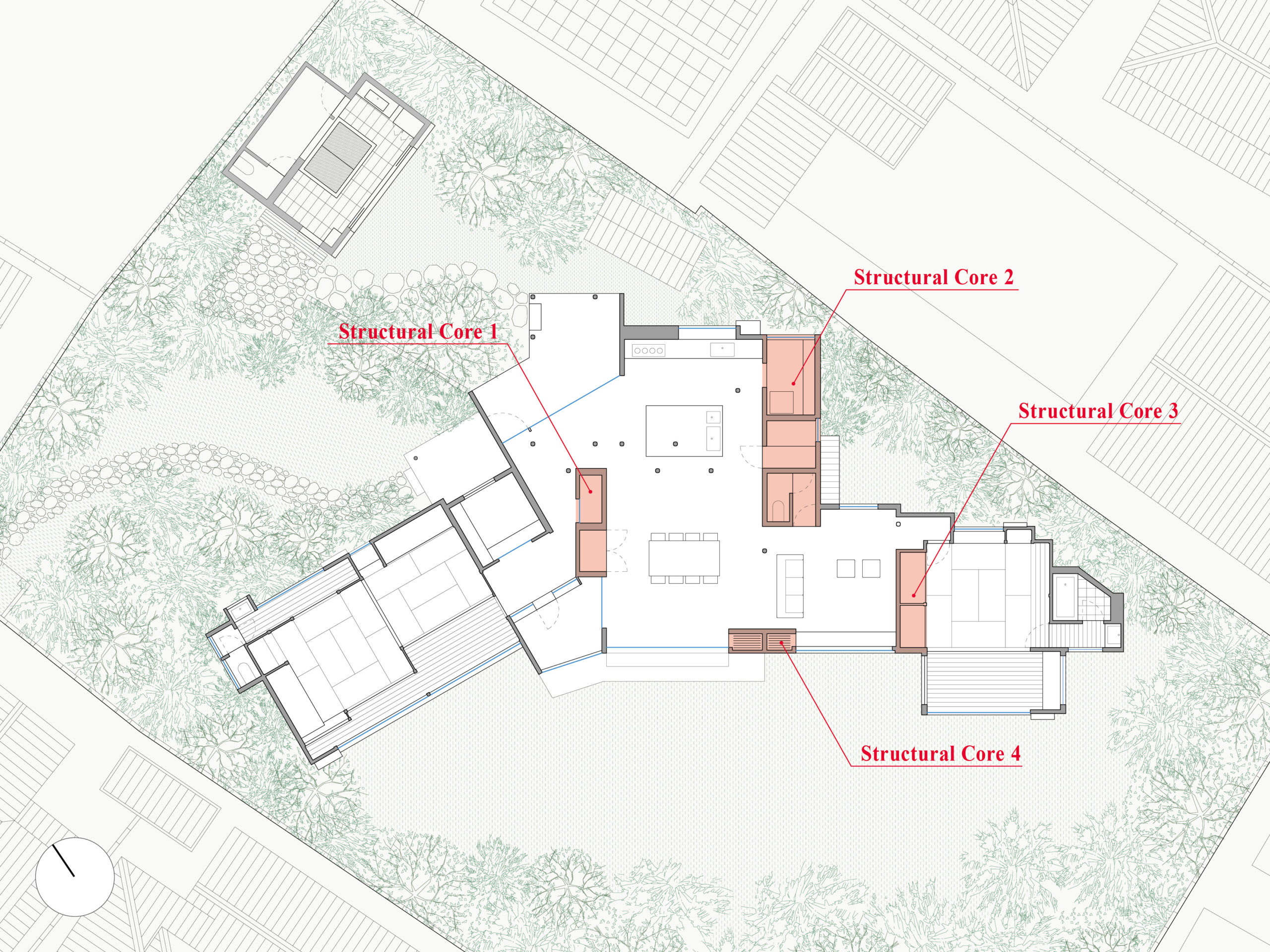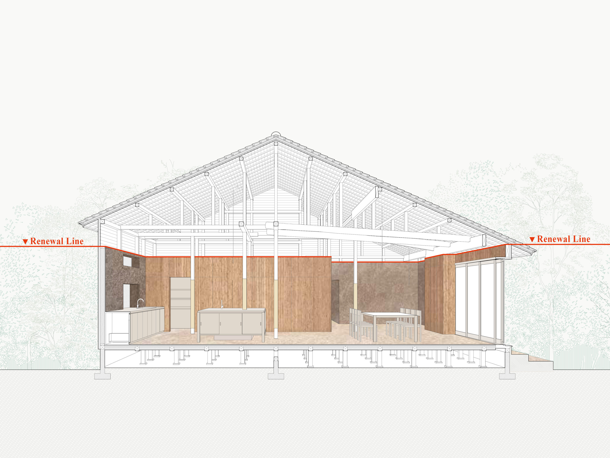 昭和初期の別荘地としての面影を色濃く遺す、鎌倉材木座の築90年・約300坪の屋敷に対する改修計画である。度重なる増改築の末、FL+2.5mを境に、下部には更新の痕跡を刻んだ土壁が、上部には90年間ほぼ手が加えられてこなかった象徴的な小屋組が残されていた。本計画ではこの対照関係を読み取り、意図的に2.5mライン以下のみに改修範囲を限定。耐力壁もすべて2.5m以下の準耐力壁として再構成している。この操作は、屋敷に刻まれた改修の歴史に呼応しつつ、建築の物語性を継承するものである。改修後、屋敷は住宅宿泊事業法に基づく一棟貸し宿として再生。制度的更新を契機に、90年越しに「別荘」的な使途へと立ち返る建築的転回を果たしている。