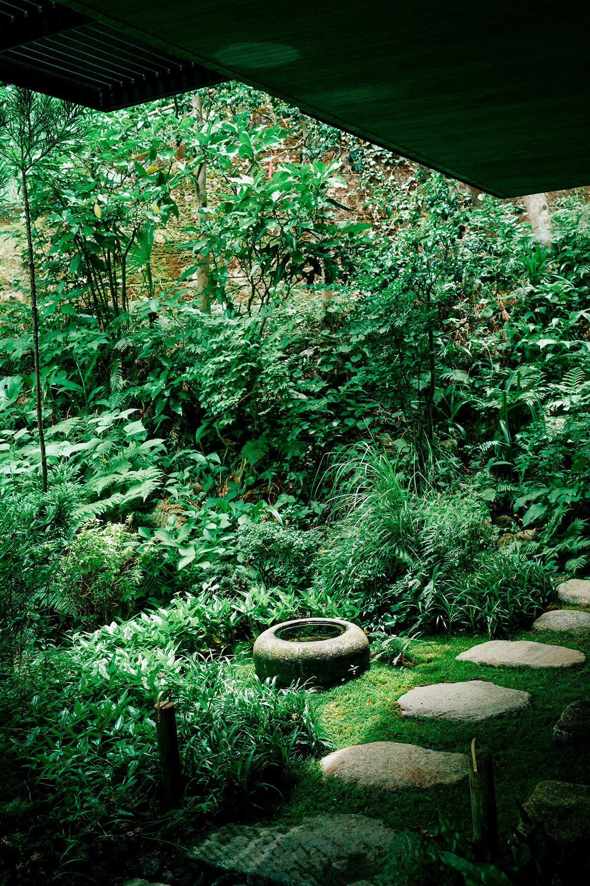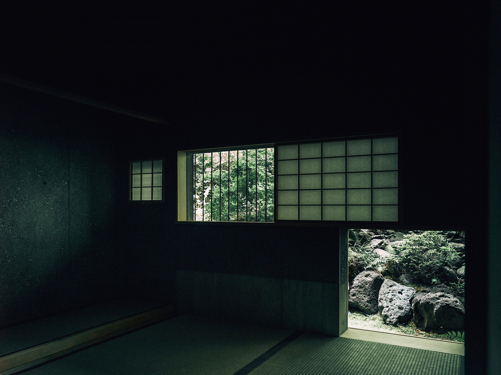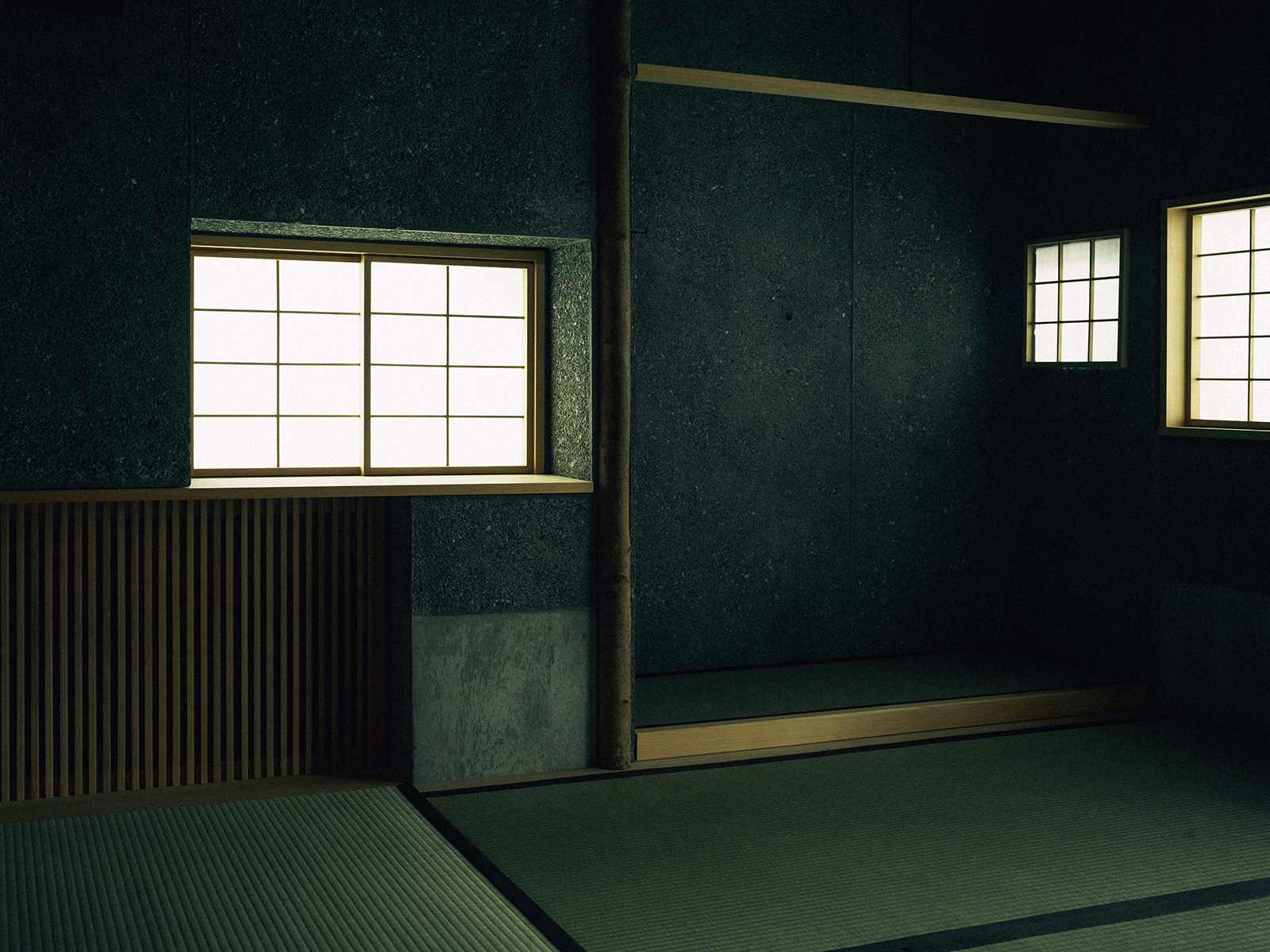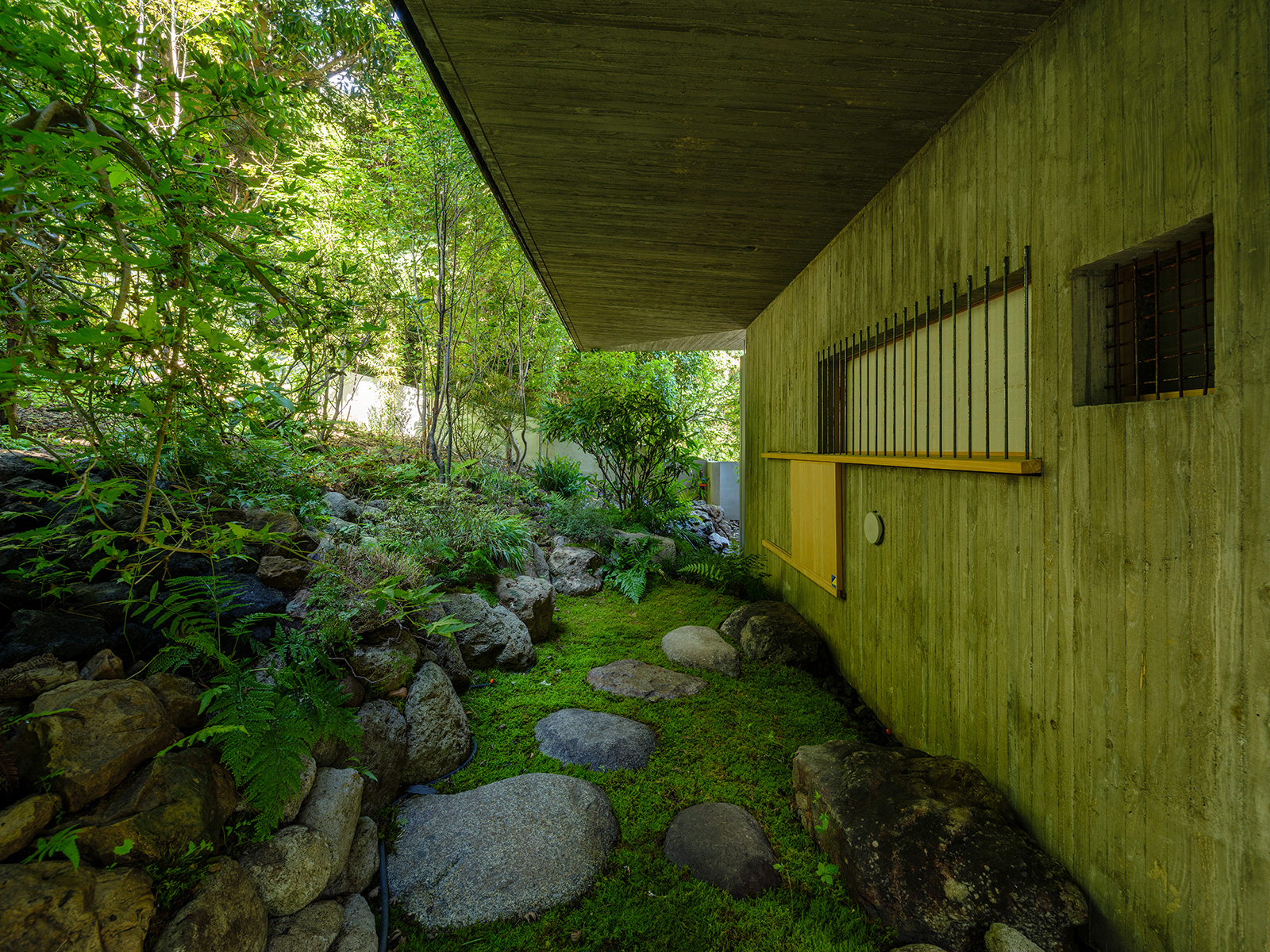 鎌倉の谷戸に設えた三畳小間の茶室の計画。敷地はレッドゾーンに指定され、安全性の観点からRC造が求められた。本計画では、草庵茶室の空間性を現代的マテリアルでいかに表現し得るかを主題とし、コンクリートを高圧洗浄を施して土壁の風合いを与え、腰貼り部分はラワン型枠で打設することで木目の転写を試みた。下地窓では竹の代わりに鉄筋を用い、造作材も吉野杉に代えて南洋材アガチスを採用した。伝統的な形式を踏まえながら、各部位において素材の置換を積極的に試みることで、現代の構法と感覚に即した茶室空間の再構成を試みた。