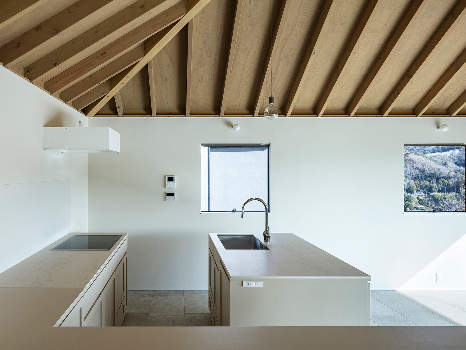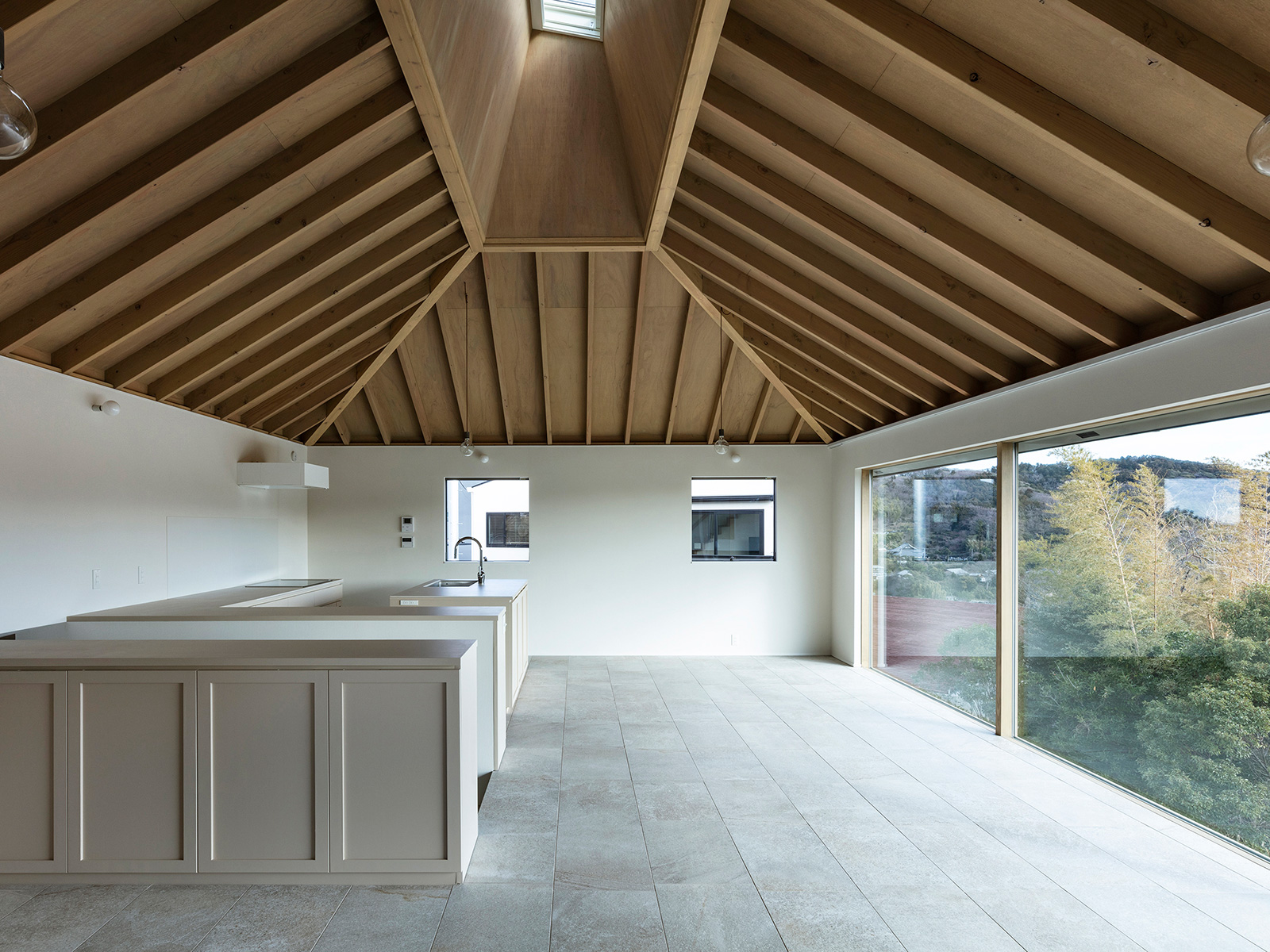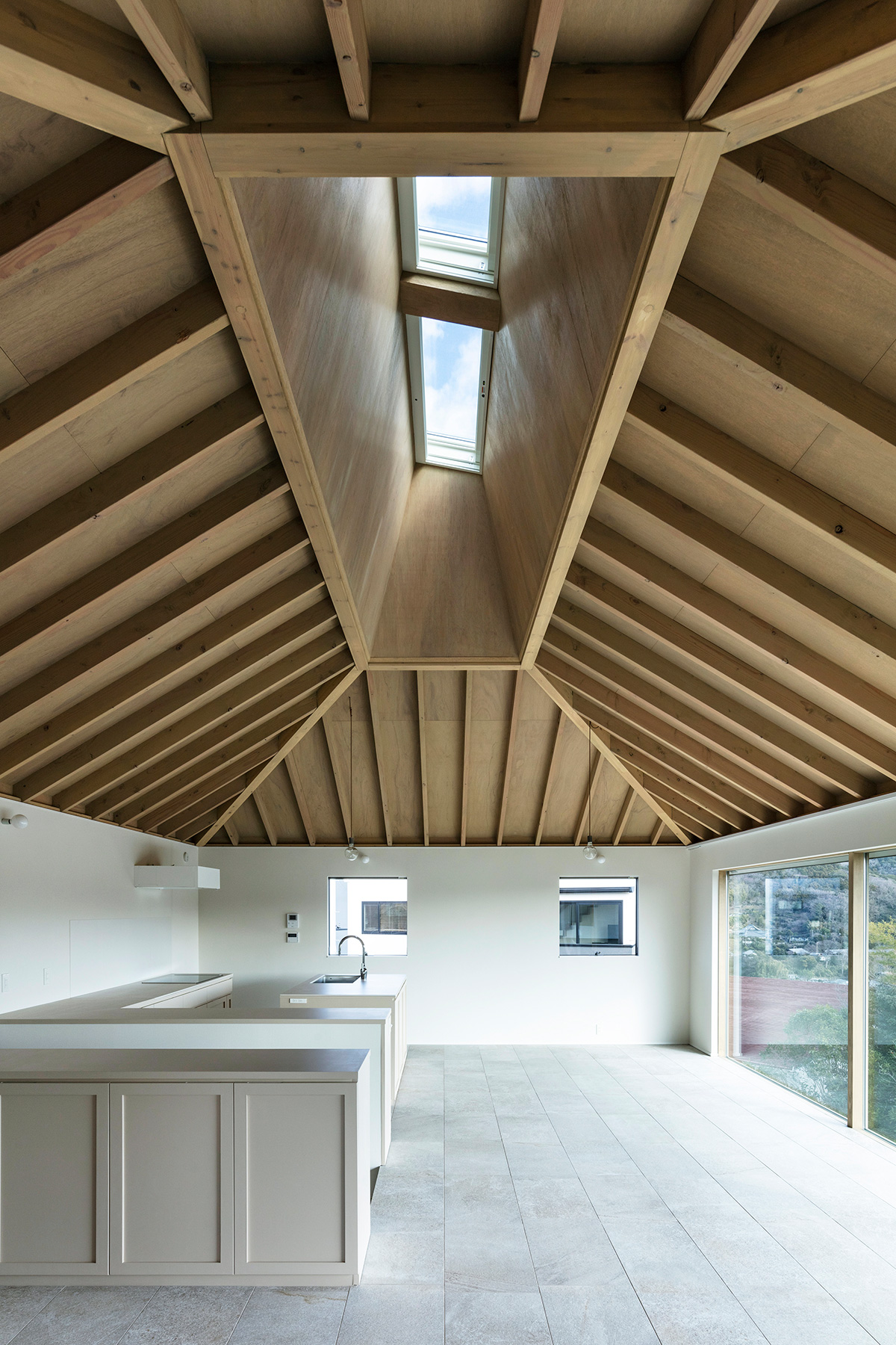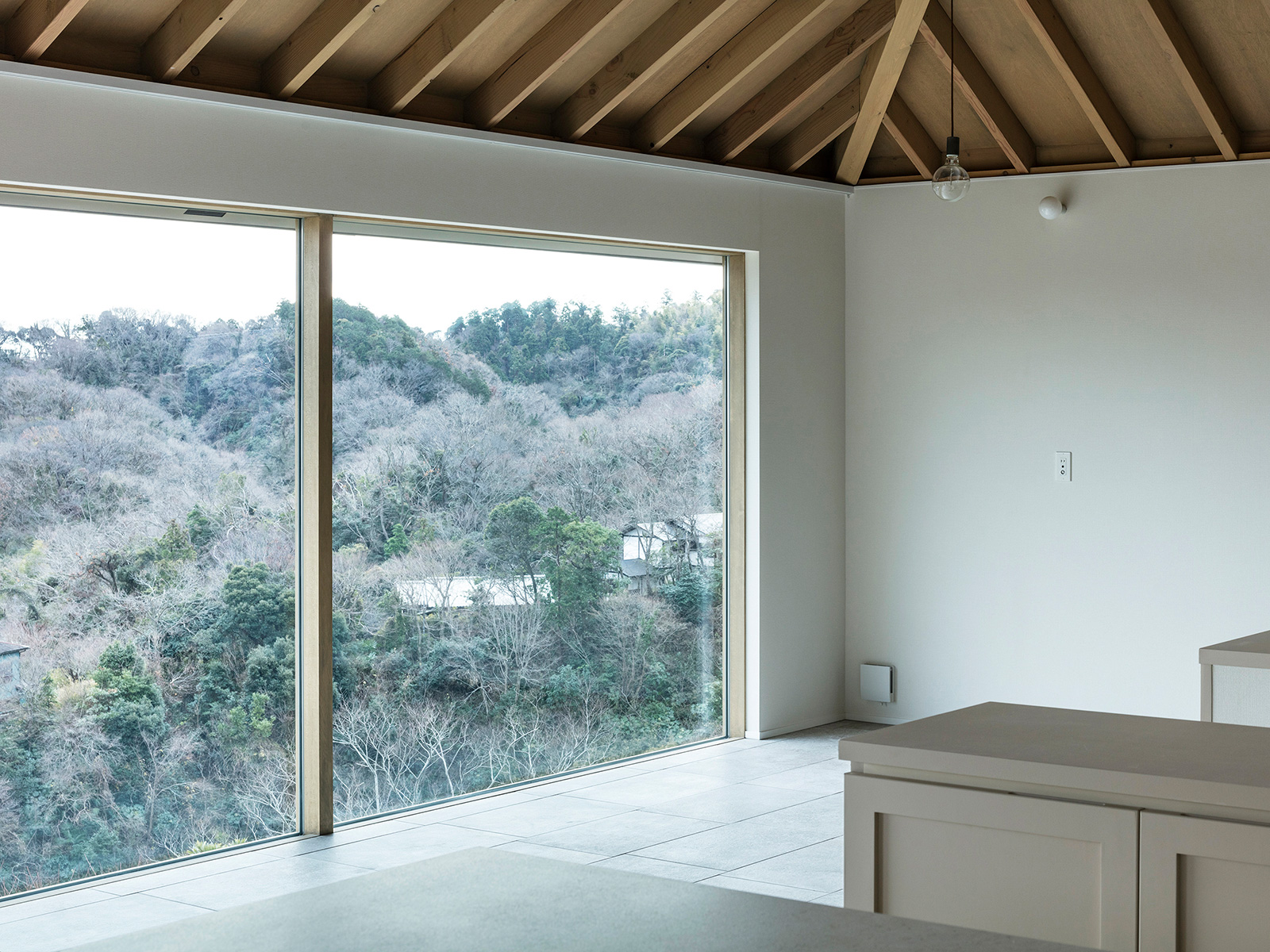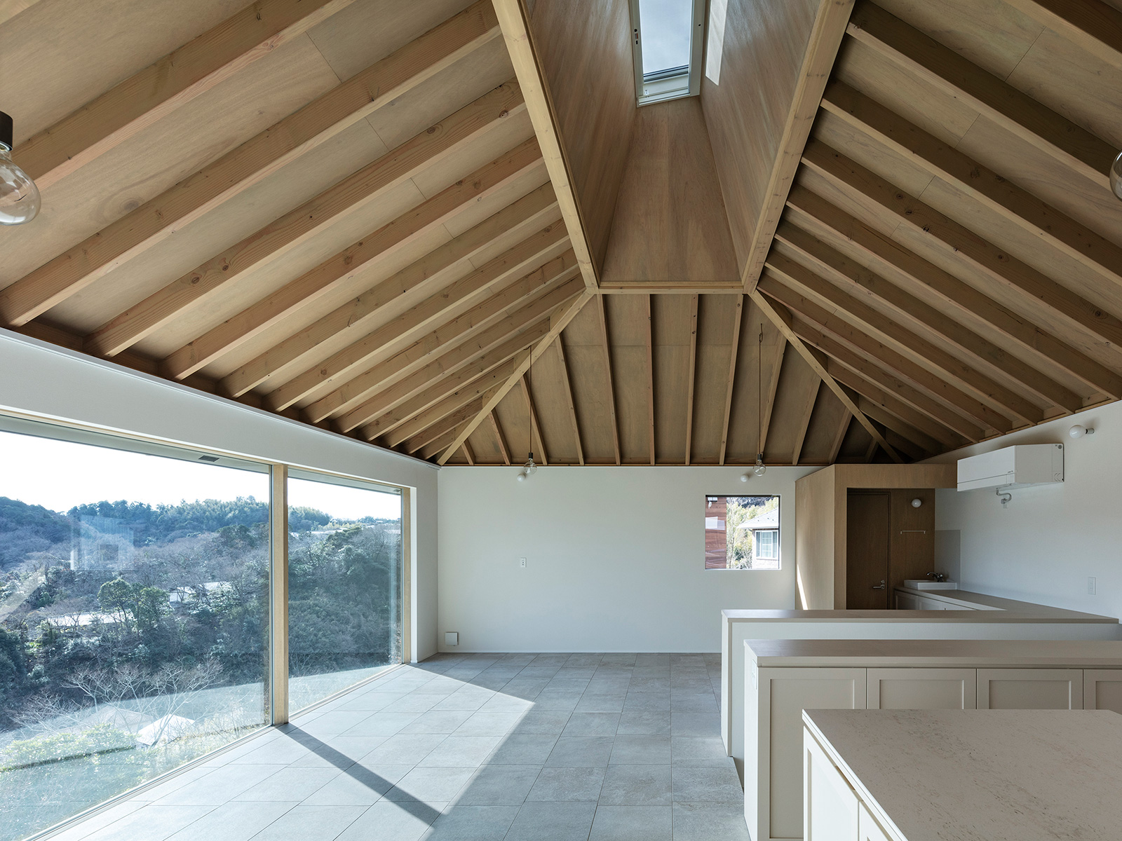 北鎌倉・六国見山を望む高台に建つ小住宅。この土地特有の雄大な眺望と頭上の空の広がりという二つの環境に応答し、それぞれを増幅する異なる形式の窓を設けた。一つは、矩形ワンルームの長辺に設けた6m超の水平連窓。六国見山の稜線を絵画的にフレーミングし、視線は外部へと向かう。もう一つは寄棟屋根の頂部に穿たれた天窓。筒状に立ち上げた側壁をもつ天窓により日射を操作し、時間とともに変容する光が空間に届く。前者は「眺める窓」、後者は「もたらす窓」として機能し、無柱空間と木架構屋根との空間的対比のなかで、光が両者の対比を明快に浮かび上がらせる。