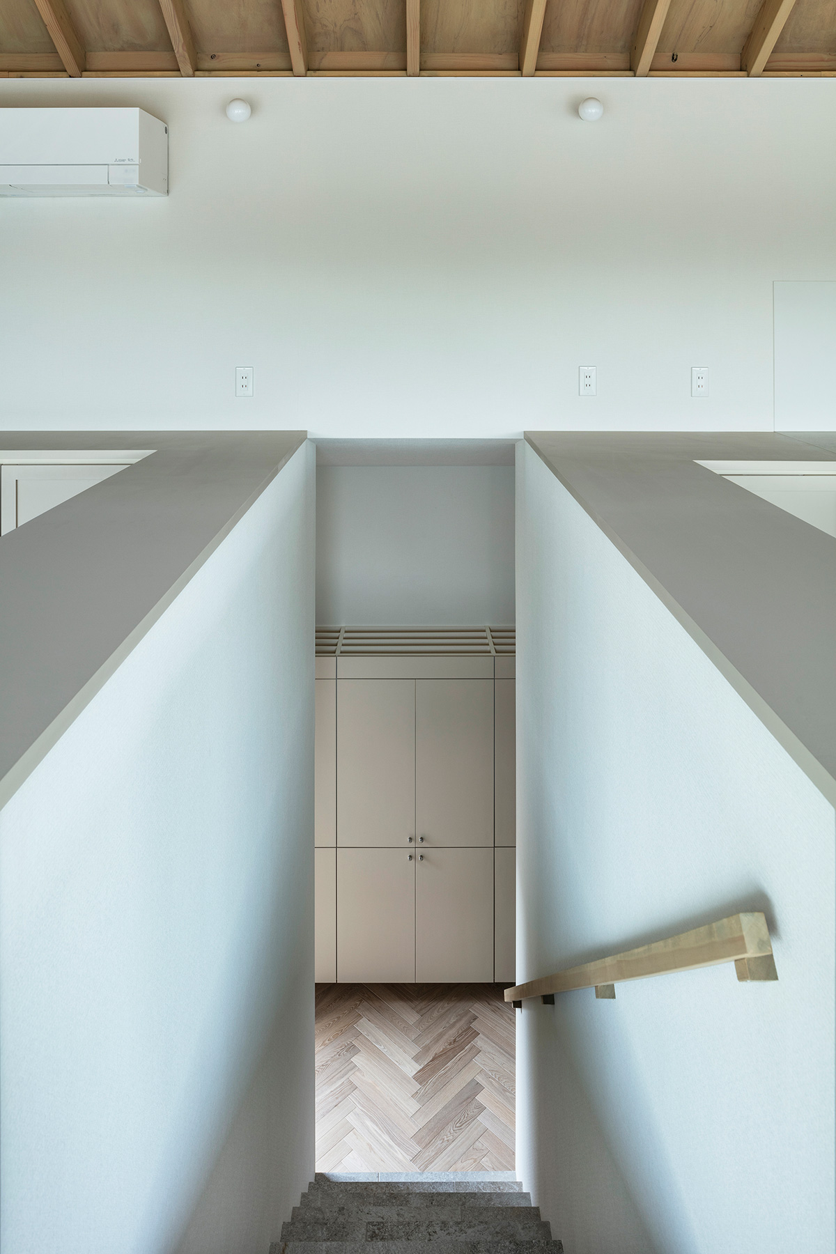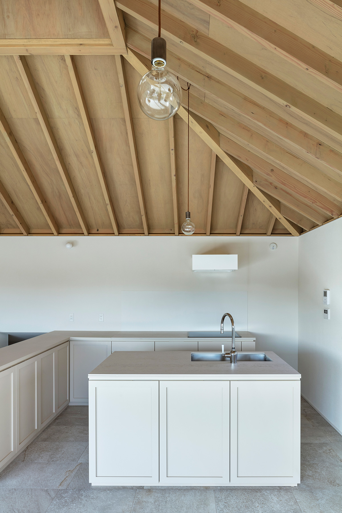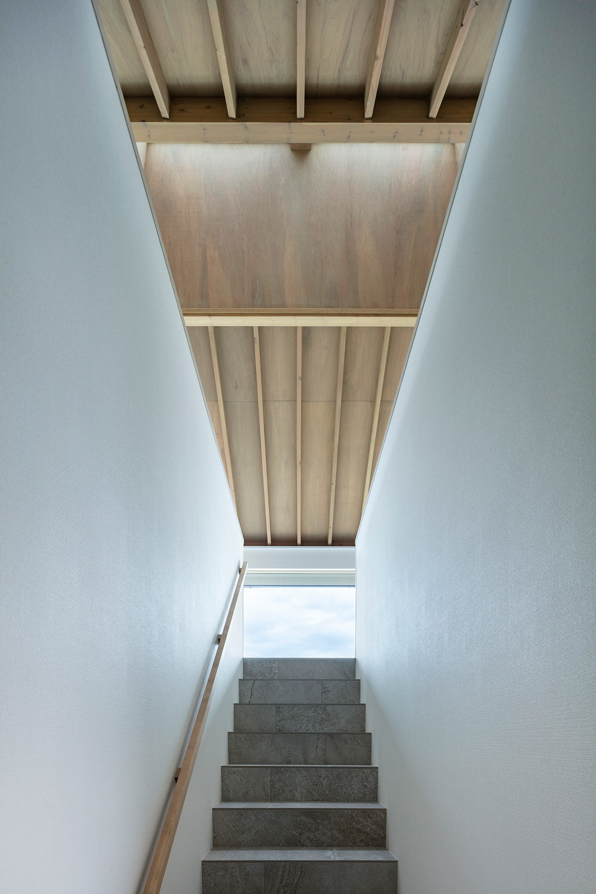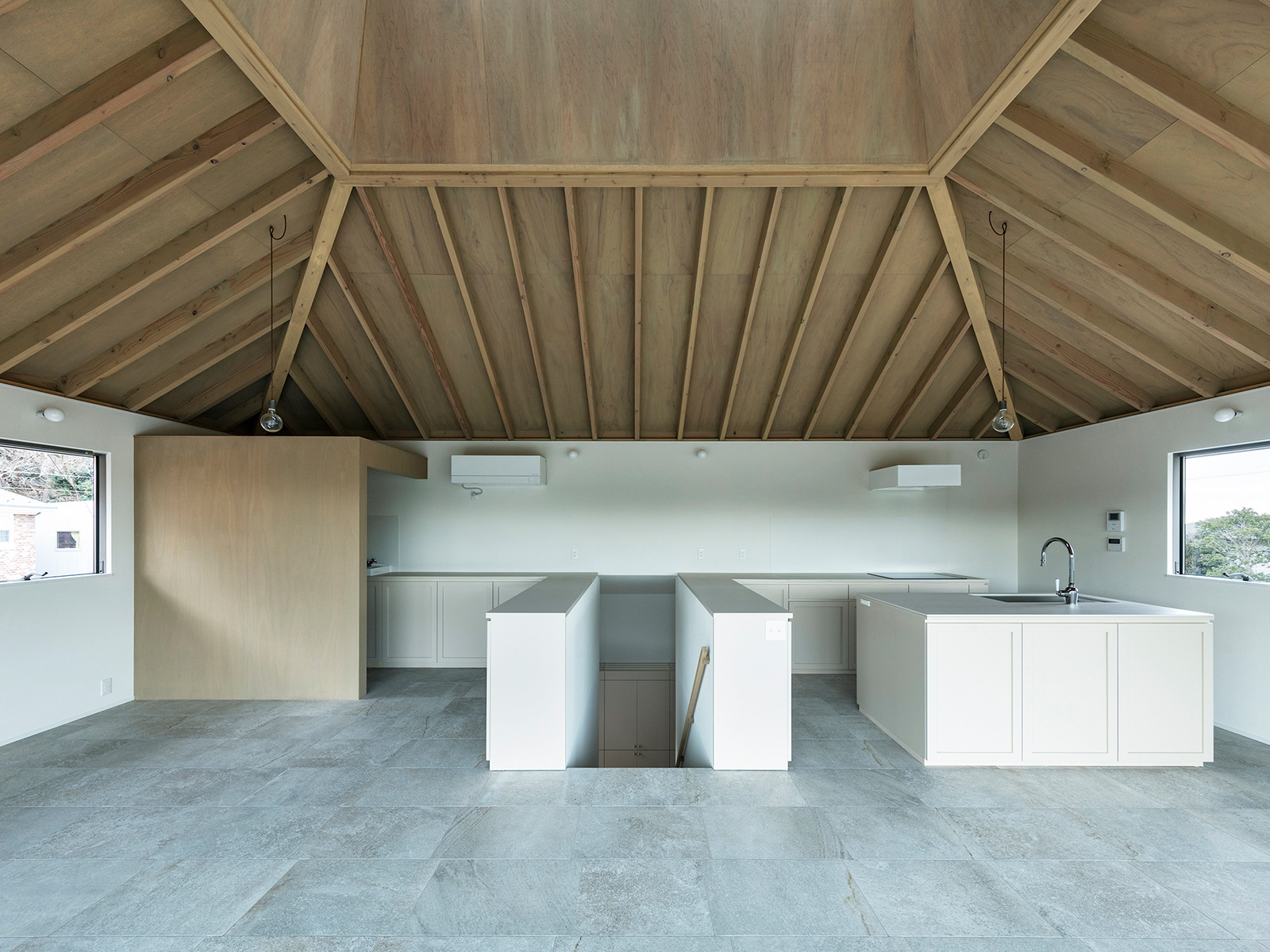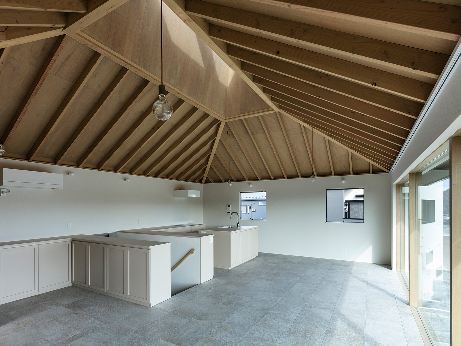 北鎌倉・六国見山を望む高台に建つ小住宅。この土地特有の雄大な眺望と頭上の空の広がりという二つの環境に応答し、それぞれを増幅する異なる形式の窓を設けた。一つは、矩形ワンルームの長辺に設けた6m超の水平連窓。六国見山の稜線を絵画的にフレーミングし、視線は外部へと向かう。もう一つは寄棟屋根の頂部に穿たれた天窓。筒状に立ち上げた側壁をもつ天窓により日射を操作し、時間とともに変容する光が空間に届く。前者は「眺める窓」、後者は「もたらす窓」として機能し、無柱空間と木架構屋根との空間的対比のなかで、光が両者の対比を明快に浮かび上がらせる。