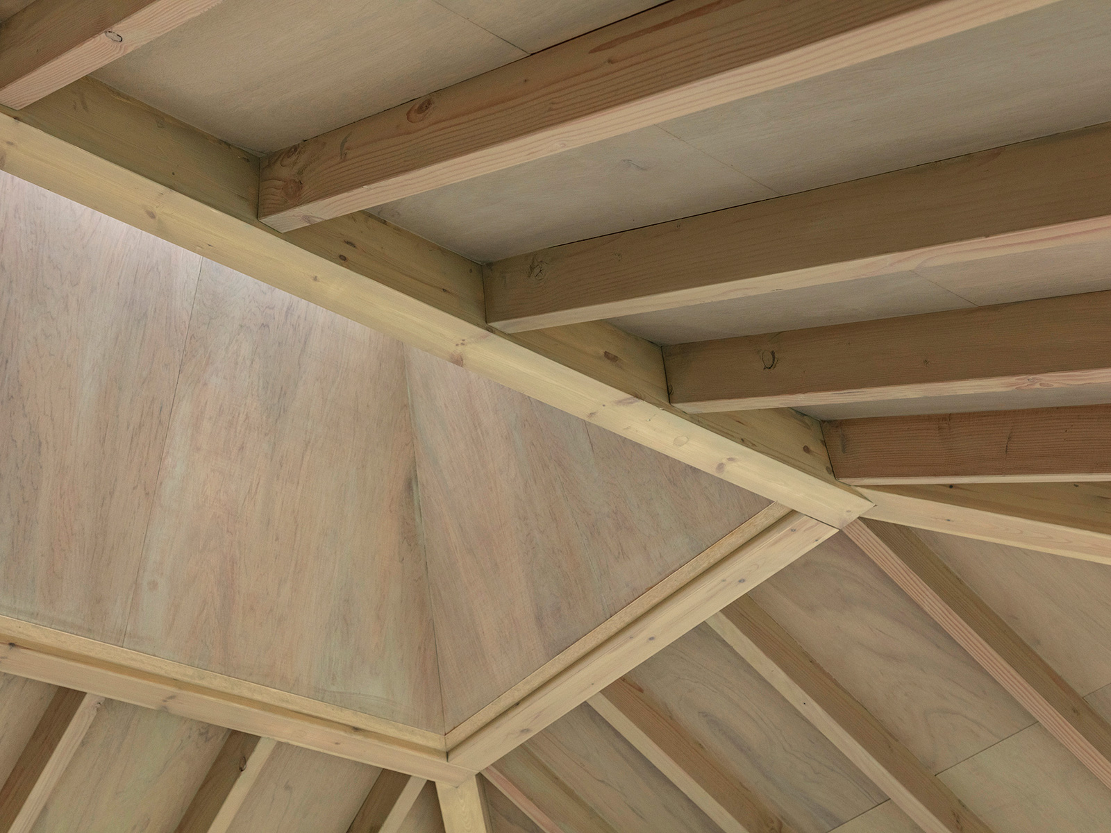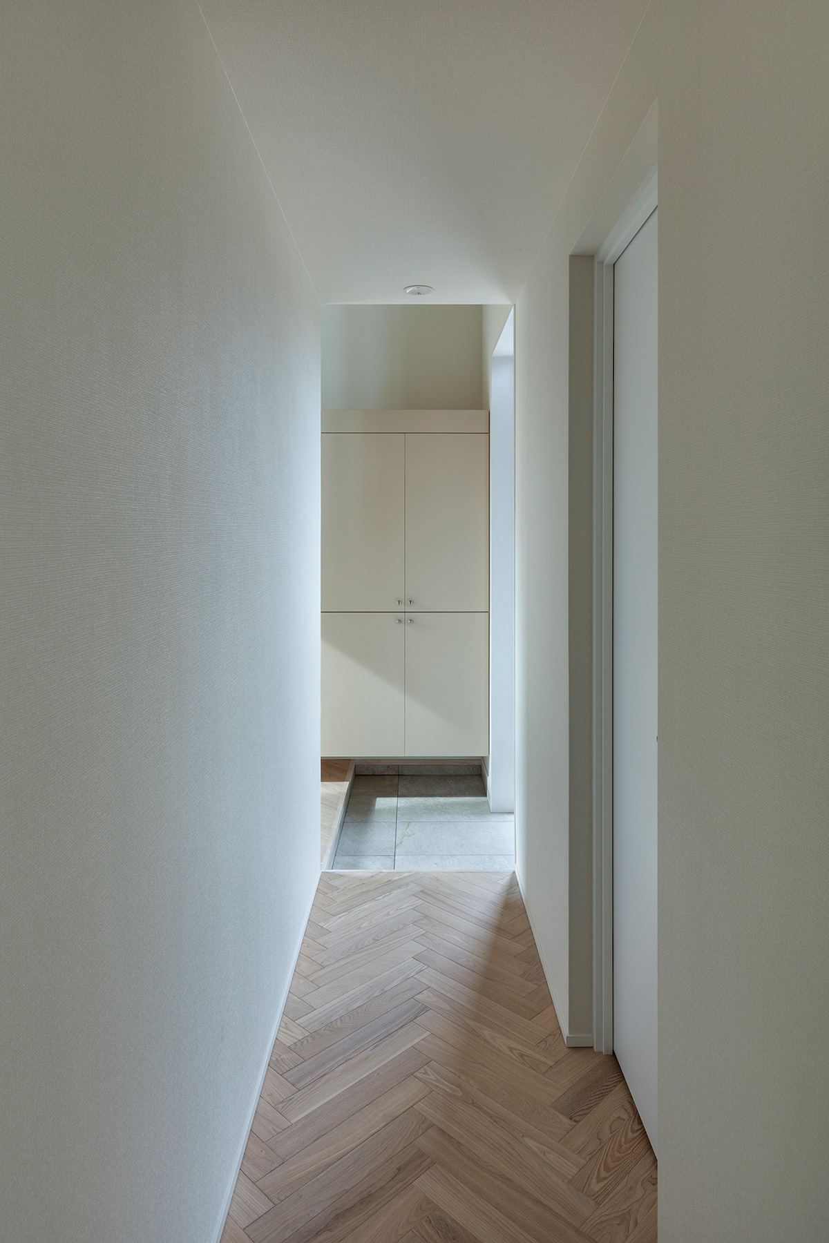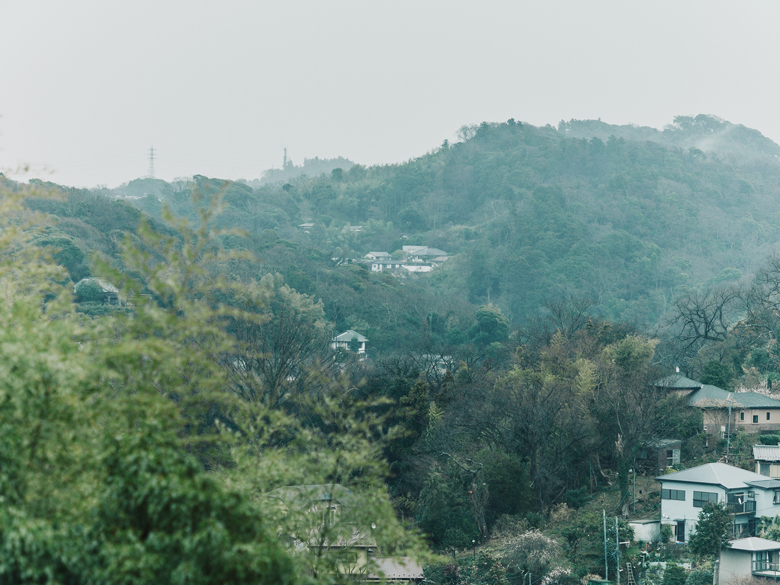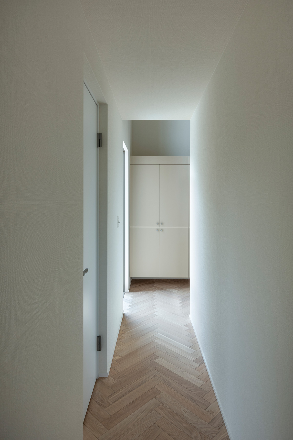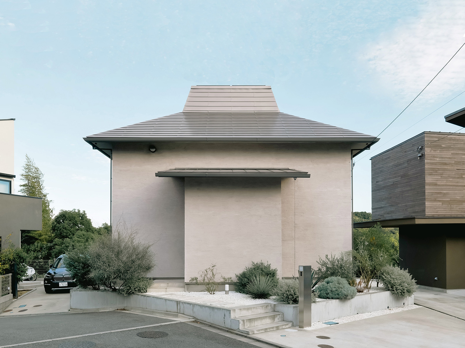 北鎌倉・六国見山を望む高台に建つ小住宅。この土地特有の雄大な眺望と頭上の空の広がりという二つの環境に応答し、それぞれを増幅する異なる形式の窓を設けた。一つは、矩形ワンルームの長辺に設けた6m超の水平連窓。六国見山の稜線を絵画的にフレーミングし、視線は外部へと向かう。もう一つは寄棟屋根の頂部に穿たれた天窓。筒状に立ち上げた側壁をもつ天窓により日射を操作し、時間とともに変容する光が空間に届く。前者は「眺める窓」、後者は「もたらす窓」として機能し、無柱空間と木架構屋根との空間的対比のなかで、光が両者の対比を明快に浮かび上がらせる。