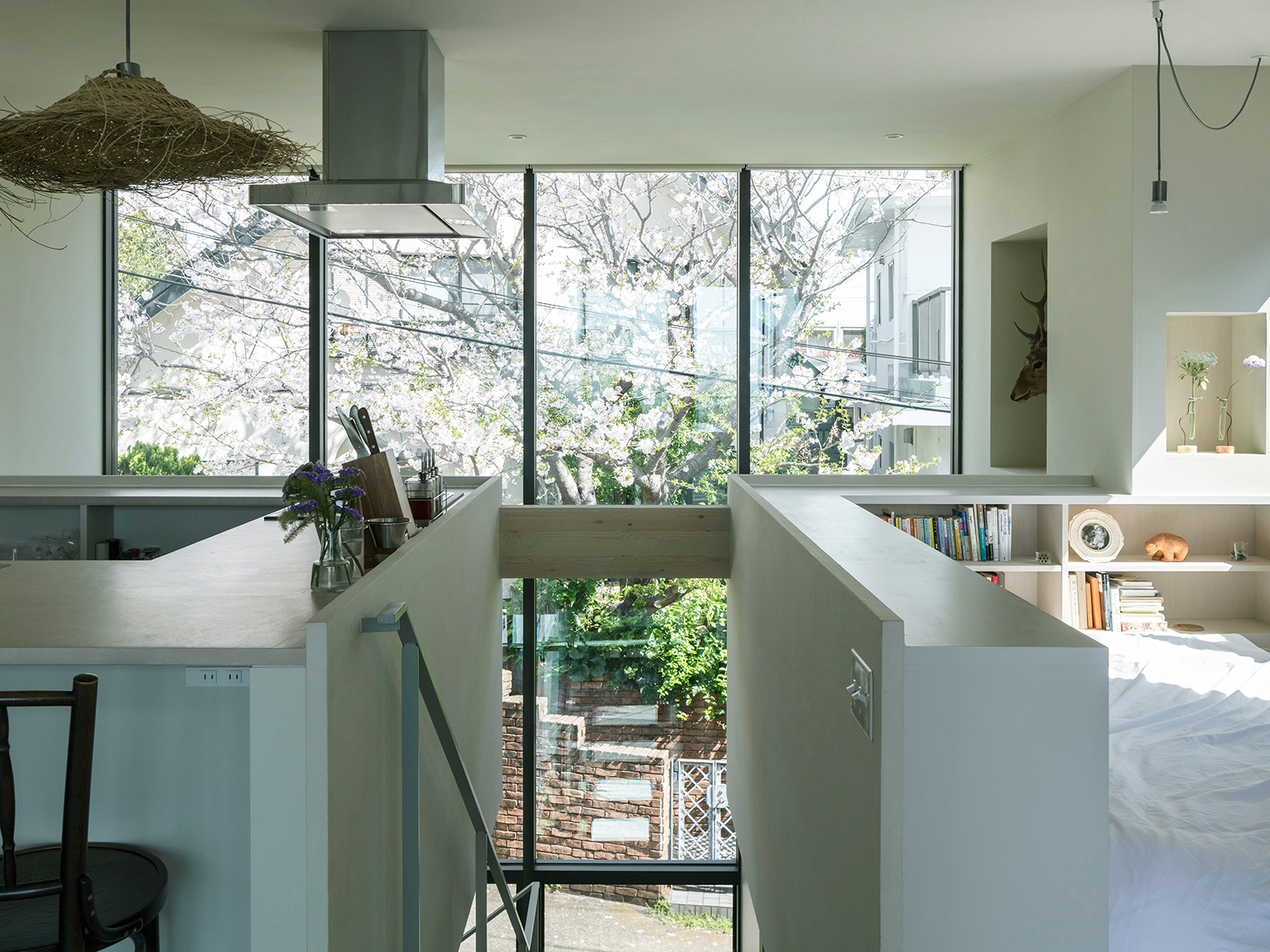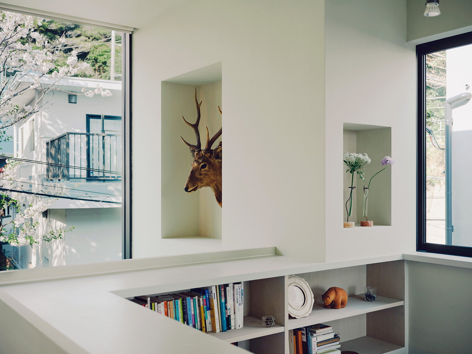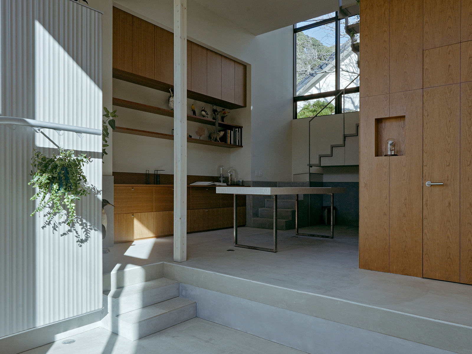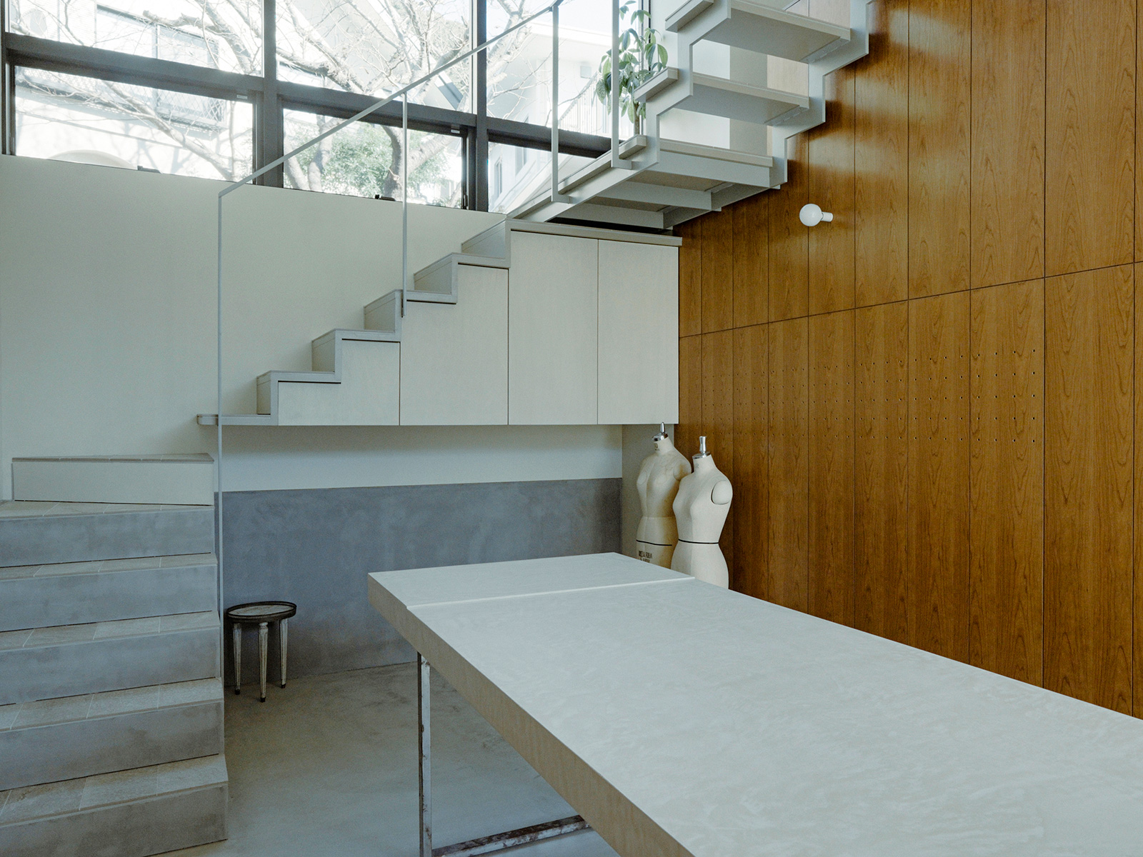 アヴァンギャルドなアパレルを手がけるデザイナー夫妻のための、アトリエ併設住宅である。本計画は、ファッションにおける〈ずらす〉〈はずす〉〈くずす〉という操作を、建築に拡張する試みである。仕上材はあえて余剰を見込まず実数で発注し、現場で生じた材料の不足や余りに即興で応答することで、入隅・出隅に“ずれ”を持ち込む納まりとした。慣習的な納まりからの脱却であると同時に、素材廃棄の削減にもつながっている。平面構成もこの操作と連動しており、異なる素材で仕上げた機能コアが、ワンルーム空間に縫い込まれるように配置されている。ファッションの文脈から引き出されたこれらの操作により、建築と素材の関係に批評的な厚みを与え、空間の均質性や設計の規範を問い直すことを試みた。