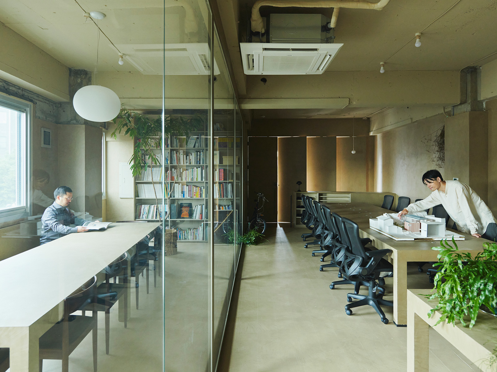 ブライダル事業を展開するスタートアップのための、打ち合わせスペース兼シェアオフィスの改修計画。場所は雑居ビル内の約80㎡のワンフロアである。空間の主題は、ブライダルの「白」が最も美しく映える背景の構築。インテリアはベージュのモノトーンで統一され、床と壁にはオリジナル調色によるモールテックスを用いている。空間はガラススクリーンによって明確に分節されるが、全体に漂う透明性や幻想性は、むしろ素材の抑制と構成の抽象性によって生み出されている。