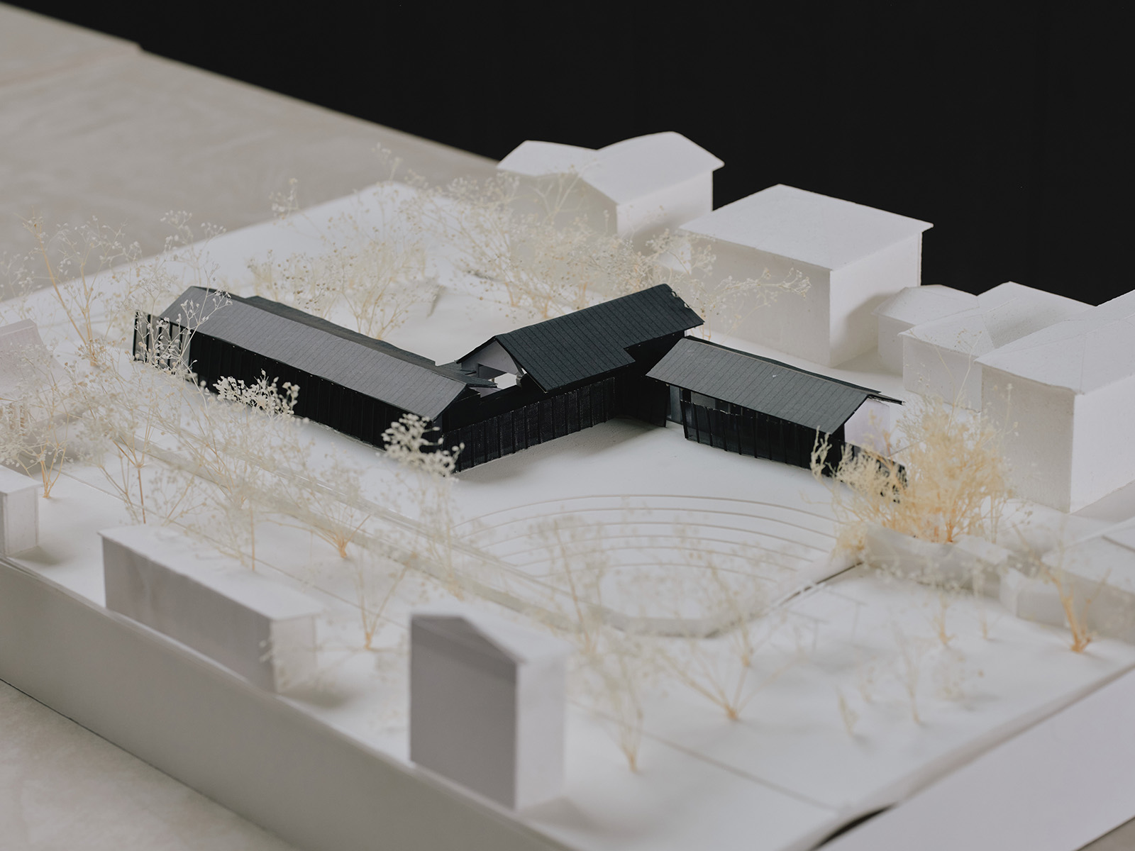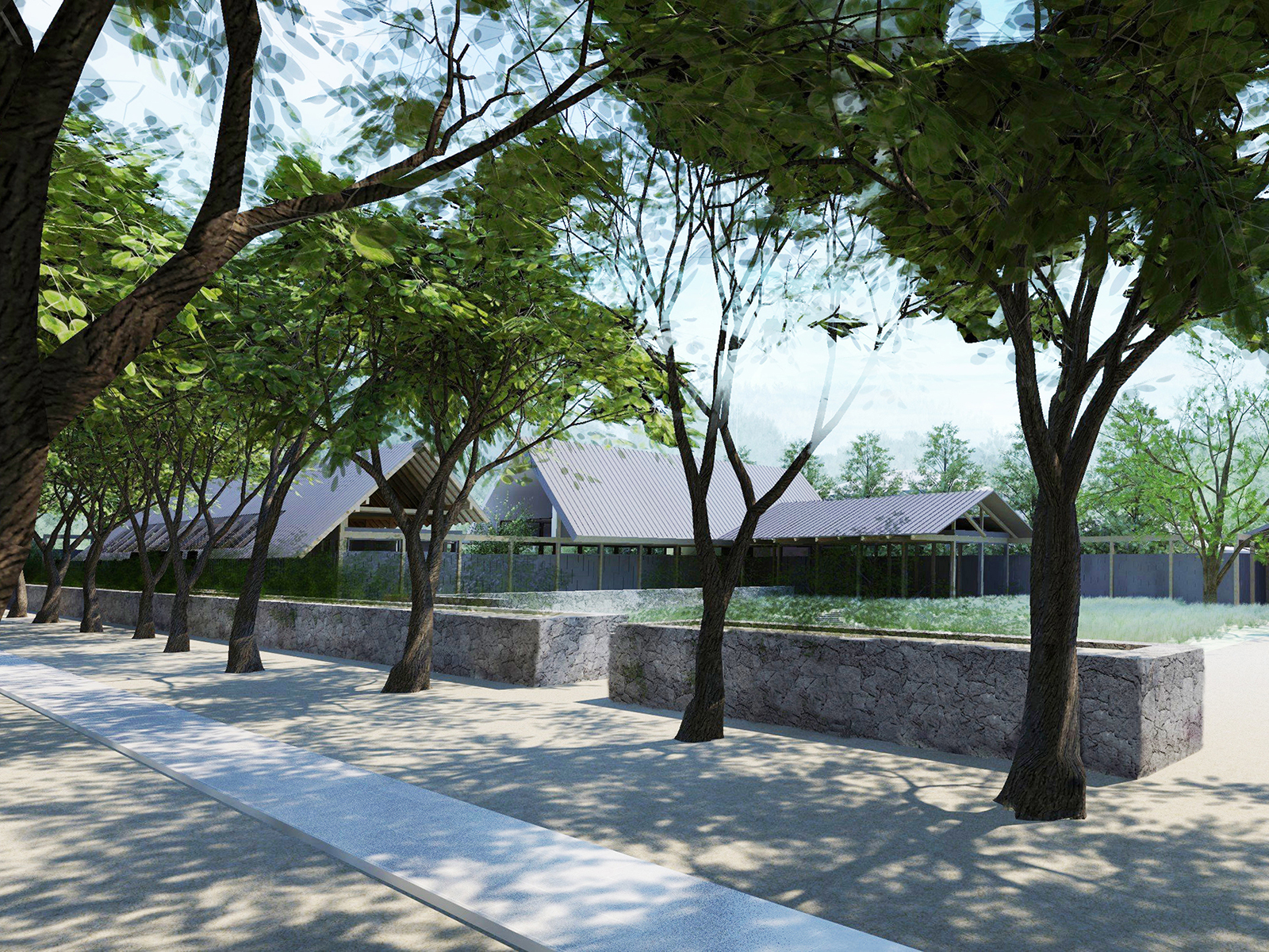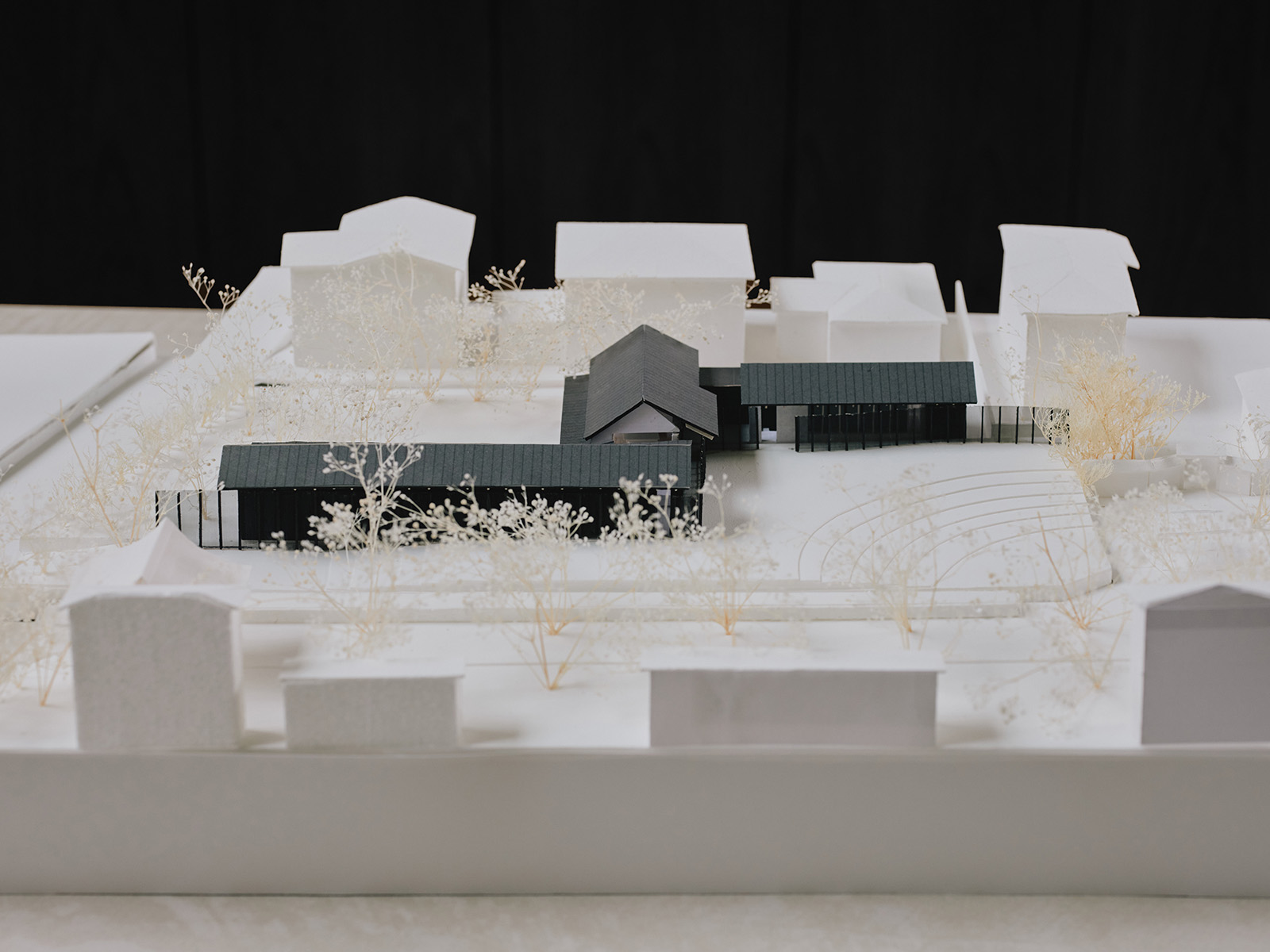 鎌倉某所の寺院の境内の一角に建つ、庫裏の計画である。開山の祖が雨乞いの祈祷を行っていたという寺院の由来を紐解き、庫裏全体に雨という主題を通した。敷地環境に応答するように平家建ての切妻屋根を雁行配置させ、庫裡と境内の境界には、極薄のスクリーンを施すことで、限りなく物体感のない仮想の境界線を設ける。晴天時、物質感の希薄なスクリーンは、雨天時にはスクリーンを雨水が伝うことで、一転して物質然とした振る舞いを始め、視覚的にも明確な境界線が出現することとなる。スクリーンを伝った雨水は、土中改良をもたらす水源となり、境内全体の環境改善を試みている。晴天・雨天で様相の異なる境界線が、開山の祖の思想を人々に伝え、かつてあった豊かな環境を境内にもたらす恵の雨としての建築となることを試みている。