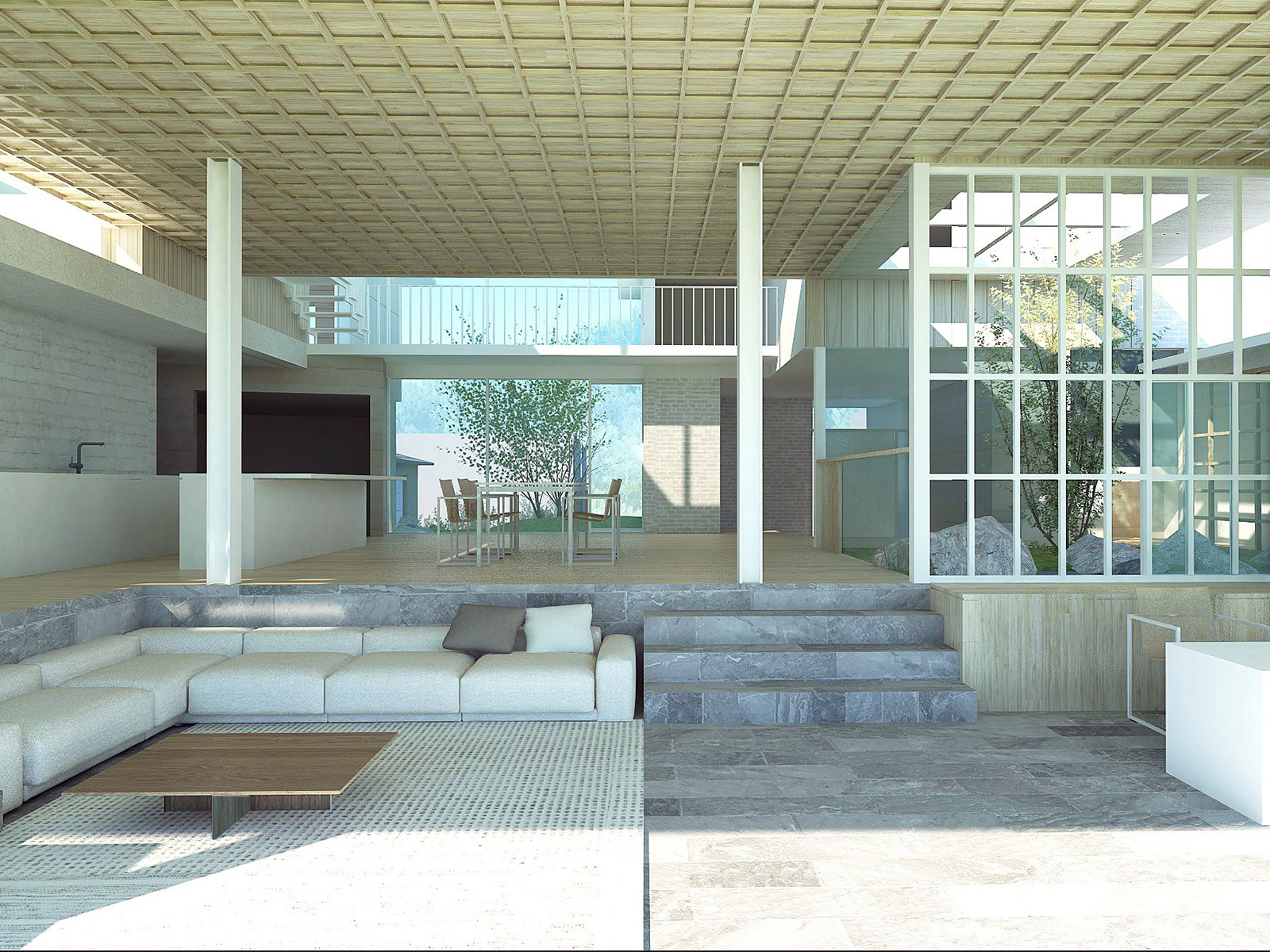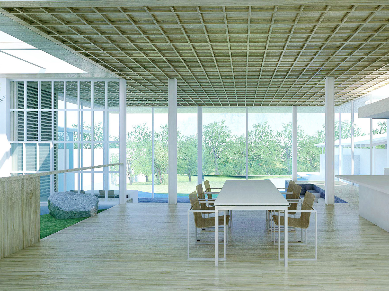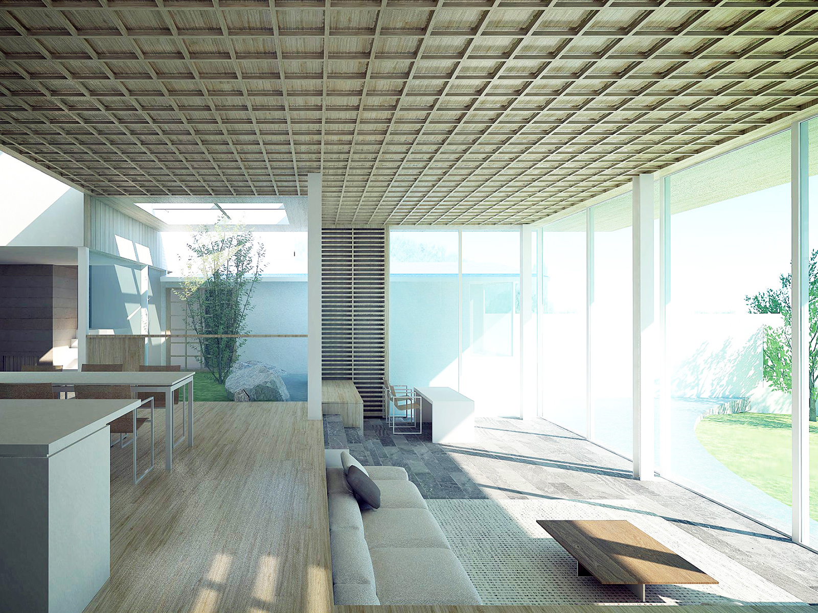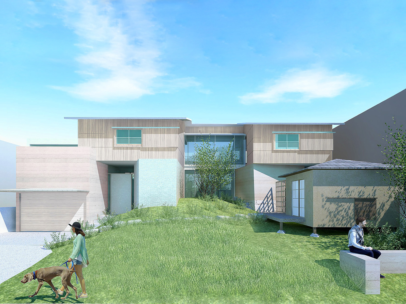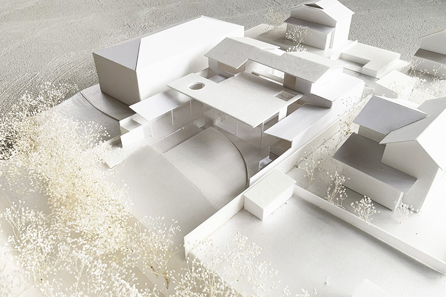 滑川沿い、敷地面積880㎡の住宅計画。北西側には住宅地が迫り、南東側には河川の開放的な風景が広がるという、スケールも性質も対照的なふたつの環境に挟まれた敷地に対し、建築的な応答を模索している。街区側にはボリュームを分節し、切妻屋根や木格子を用いた親密な構成を、河川側には水平性を強調した開放的な構成を想定。両極の風景に対して中庸的な調停に収まるのではなく、それぞれの性格を空間が積極的に引き受けることで、アンビバレンツな二面性の共存を図っている。