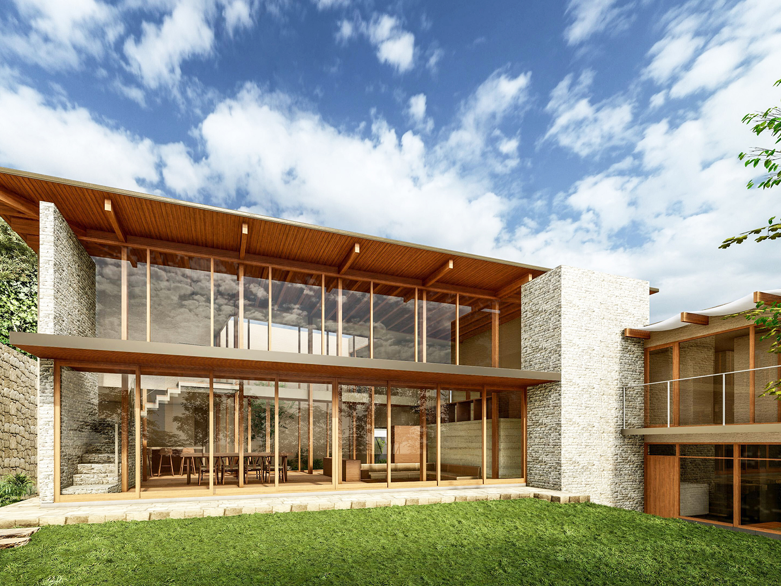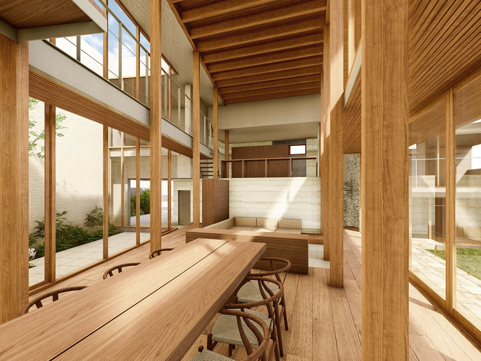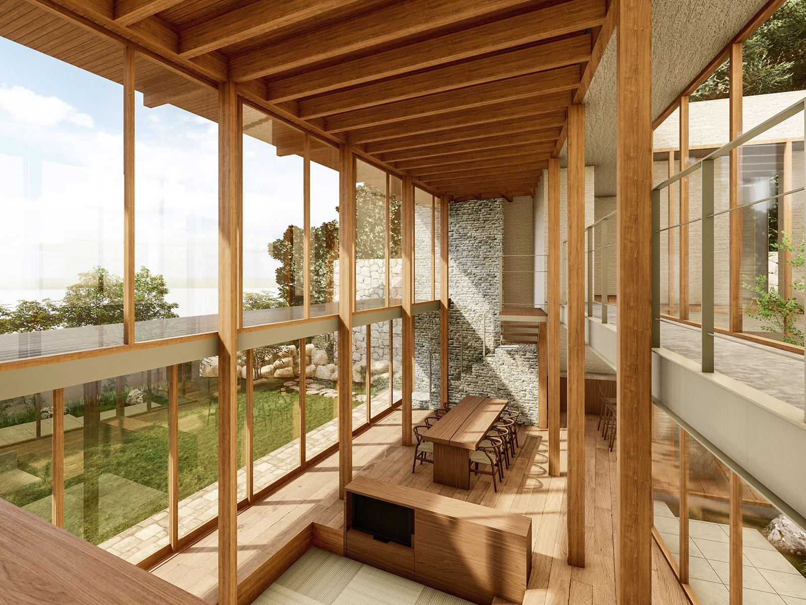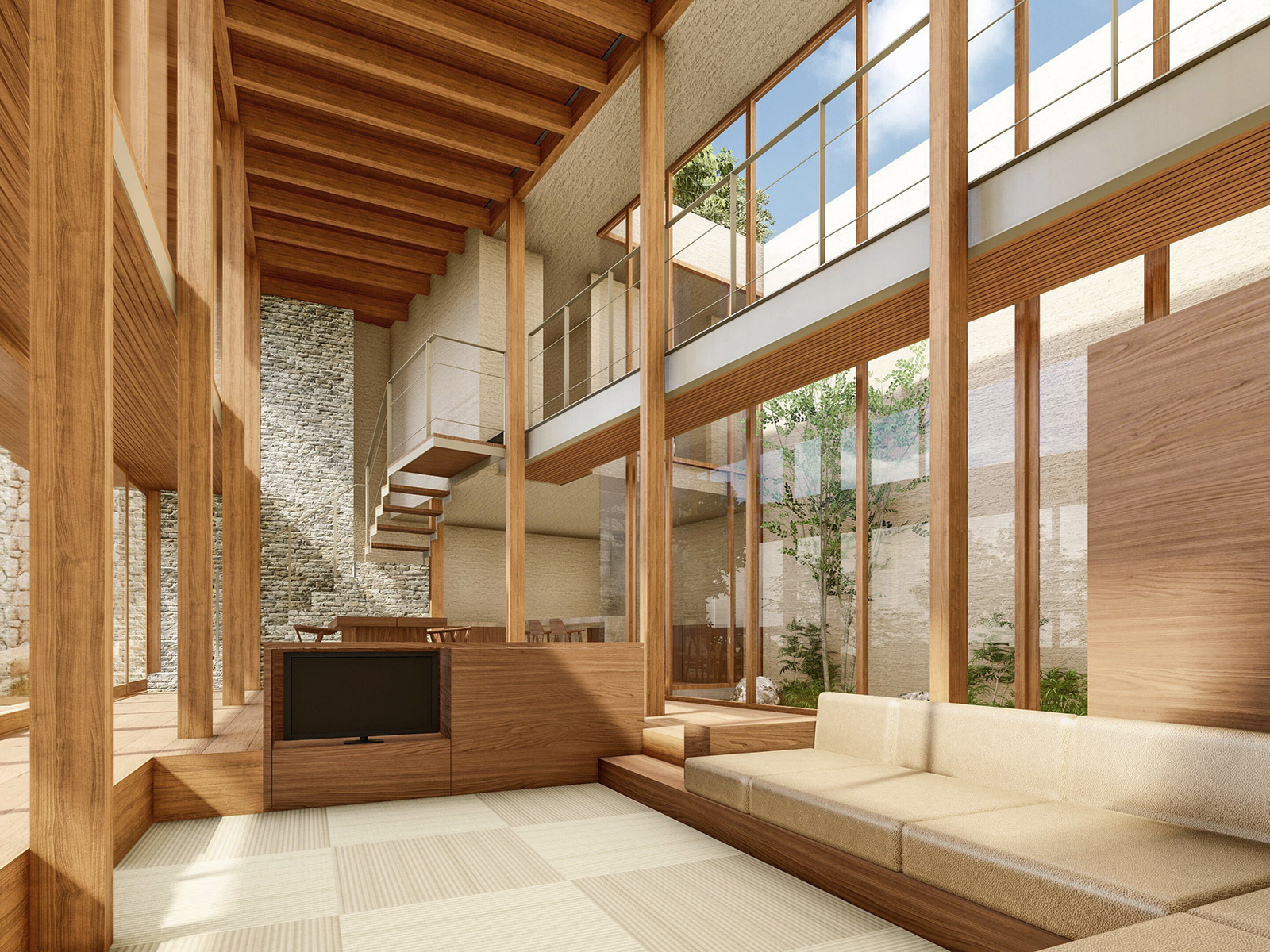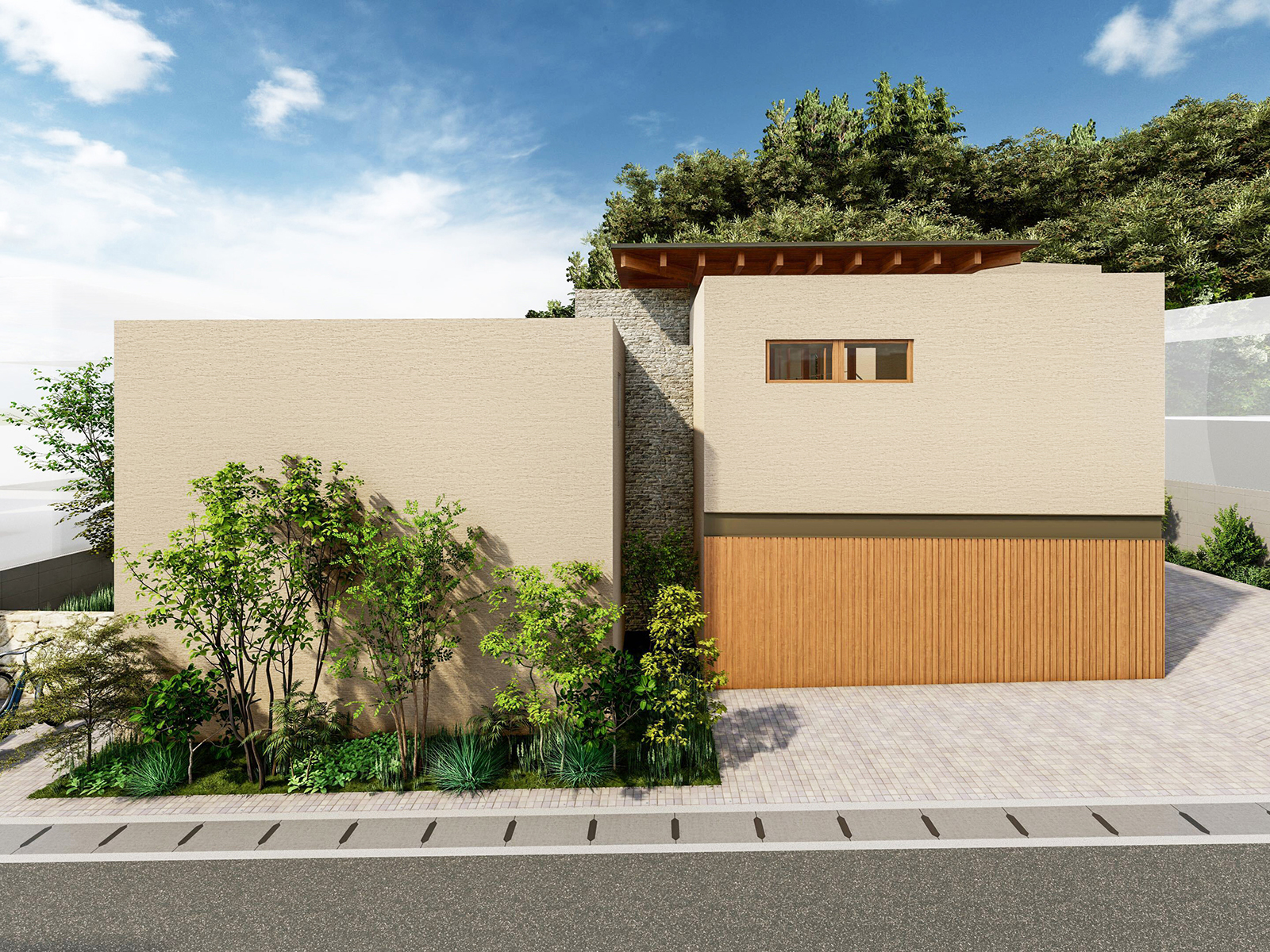 鎌倉旧市街、駅からほど近い住宅街に位置する約400㎡の敷地に計画された邸宅である。西側に山林を背負い、東側は街路に面するという、都市と自然が交差する環境に対して、建築はL字型の構成で南西に主庭を囲むかたちをとる。建物の中央には丘状の中庭を設け、山の木々と中庭の植栽──すなわち外と内の自然が、互いに入り込み重なり合うことで、奥行きと透明性のある空間を生み出そうとしている。