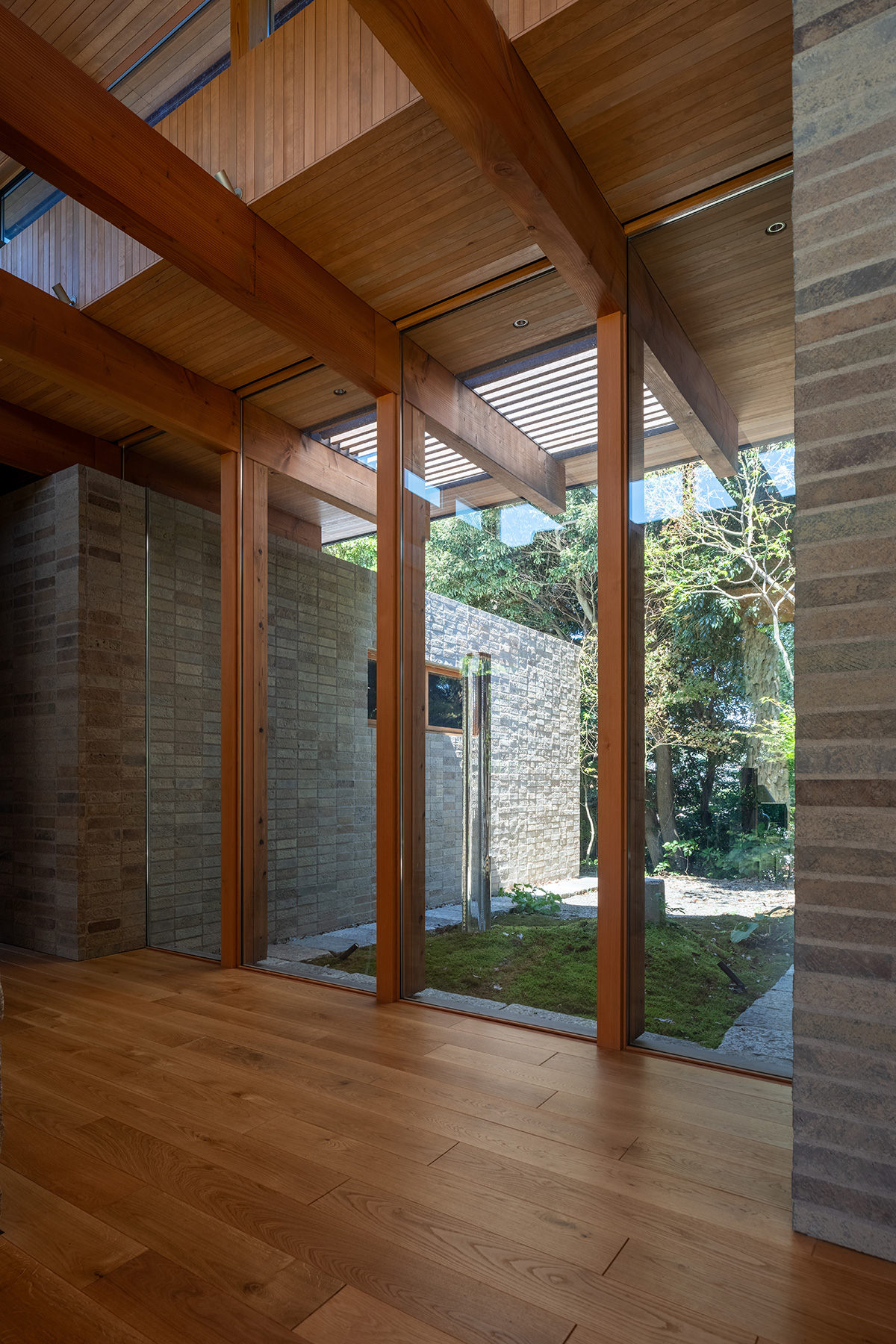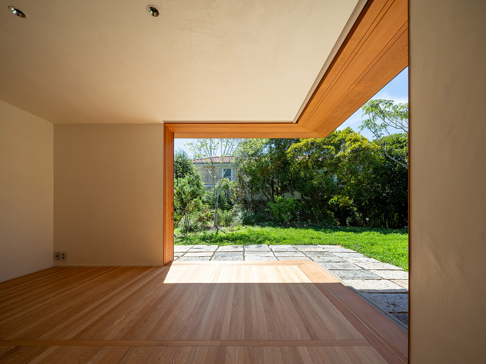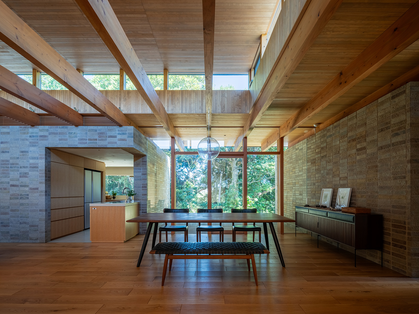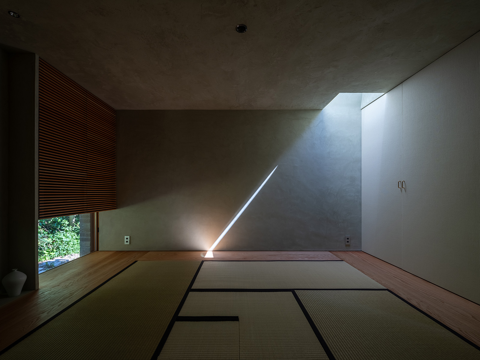 東京近郊、約1,000㎡の敷地に計画された戸建住宅。都市と自然の接点に位置し、東側には隣家が接して都市的スケールを示す一方、西側には雑木林が広がり、自然の密度を感じさせる。四方に異なるキャラクターをもつこの周辺環境に応答し、5つの個室ボリュームを丁寧に配置。そのあいだに庭を挿入することで、「開放感」と「親密さ」のバランスを調整した。ボリュームに囲まれた中央のスペースにはリビングダイニングを設け、上部にはそれらをまたぐように大梁を架け、その梁上に立てた束が屋根を支持しつつ、吹き抜けを形成している。空と光を導くこの垂直の抜けが「開放感」を、構造の量感が「親密さ」を生み出す。都市と自然の境界において、内と外、建築と環境の関係を再定義する構成である。
