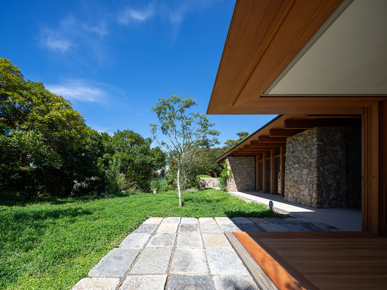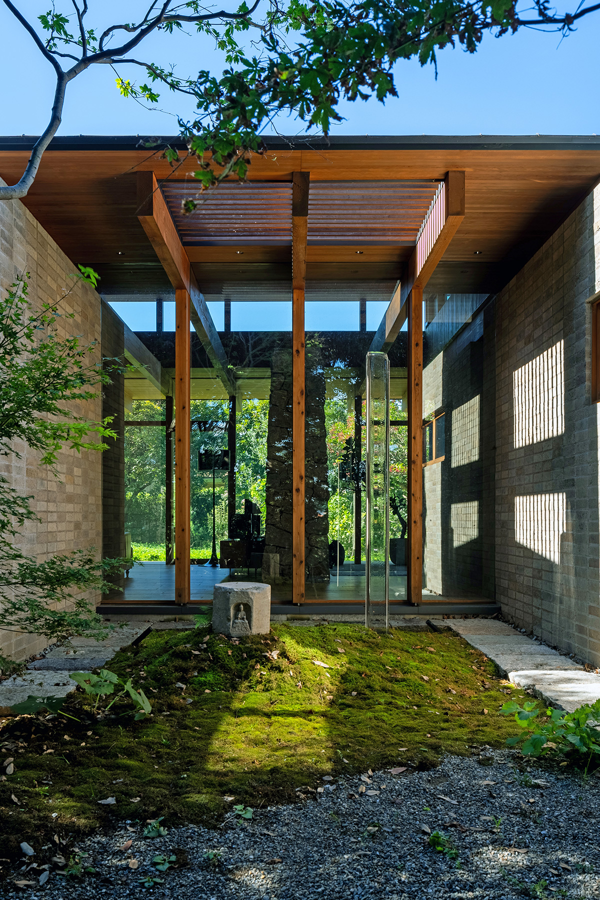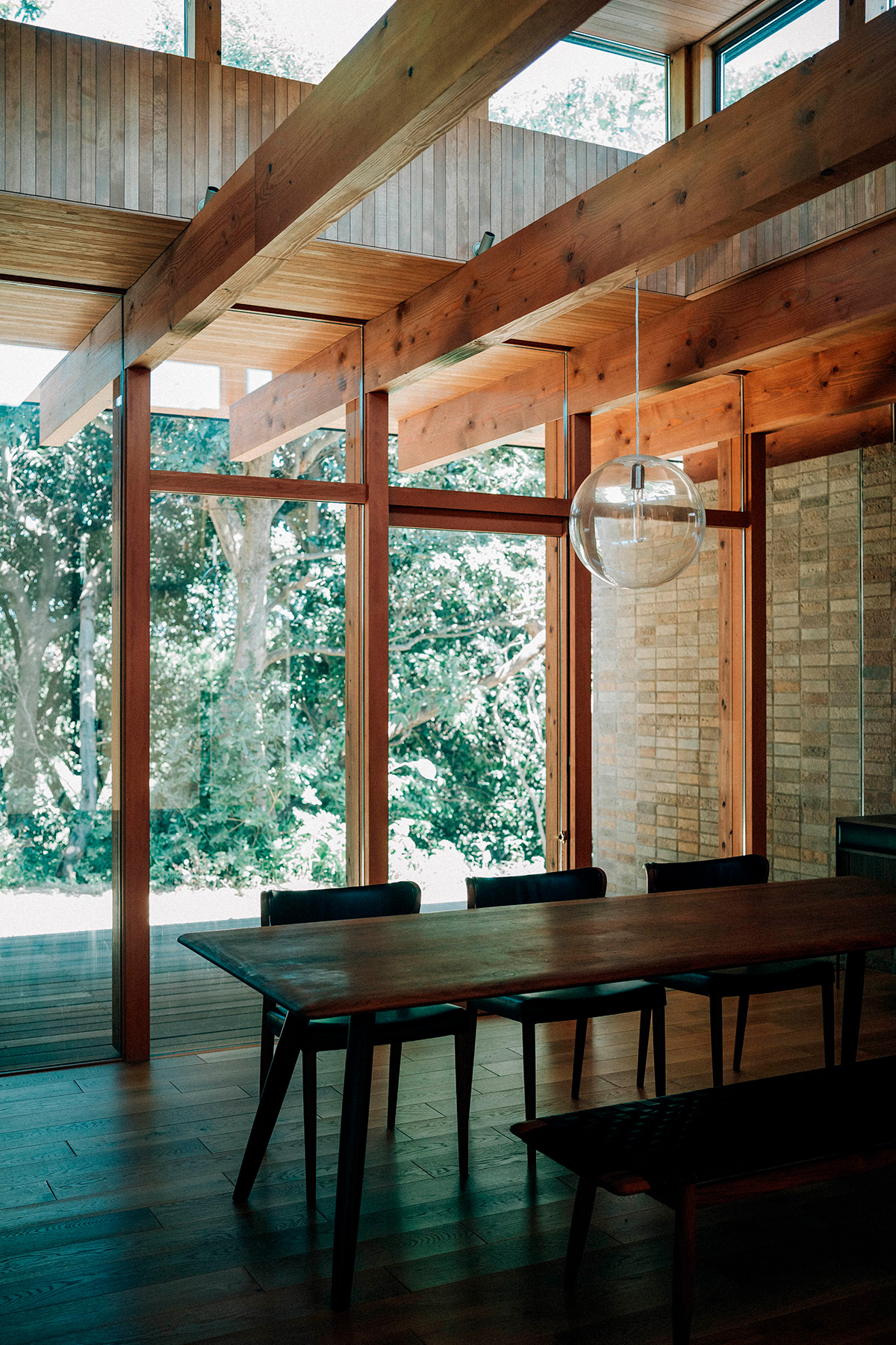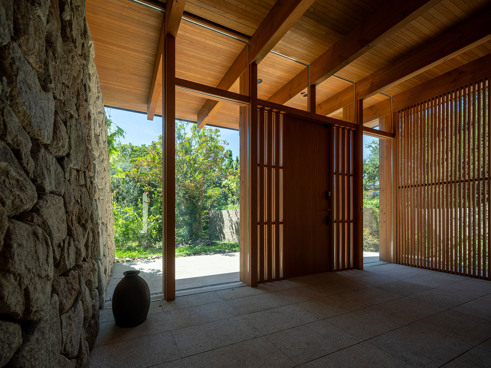 東京近郊、約1,000㎡の敷地に計画された戸建住宅。都市と自然の接点に位置し、東側には隣家が接して都市的スケールを示す一方、西側には雑木林が広がり、自然の密度を感じさせる。四方に異なるキャラクターをもつこの周辺環境に応答し、5つの個室ボリュームを丁寧に配置。そのあいだに庭を挿入することで、「開放感」と「親密さ」のバランスを調整した。ボリュームに囲まれた中央のスペースにはリビングダイニングを設け、上部にはそれらをまたぐように大梁を架け、その梁上に立てた束が屋根を支持しつつ、吹き抜けを形成している。空と光を導くこの垂直の抜けが「開放感」を、構造の量感が「親密さ」を生み出す。都市と自然の境界において、内と外、建築と環境の関係を再定義する構成である。