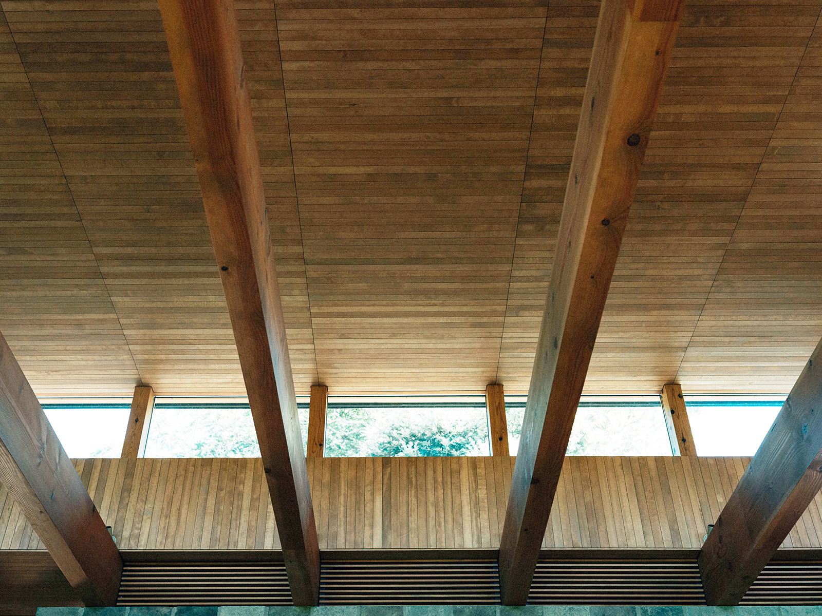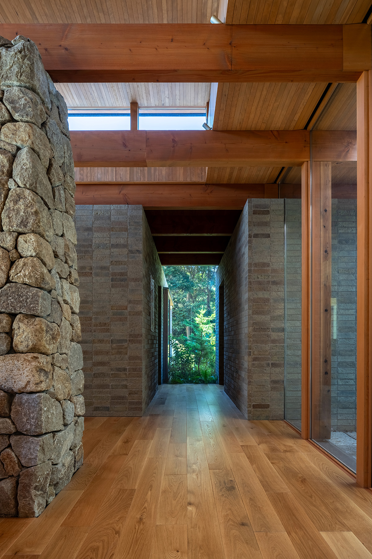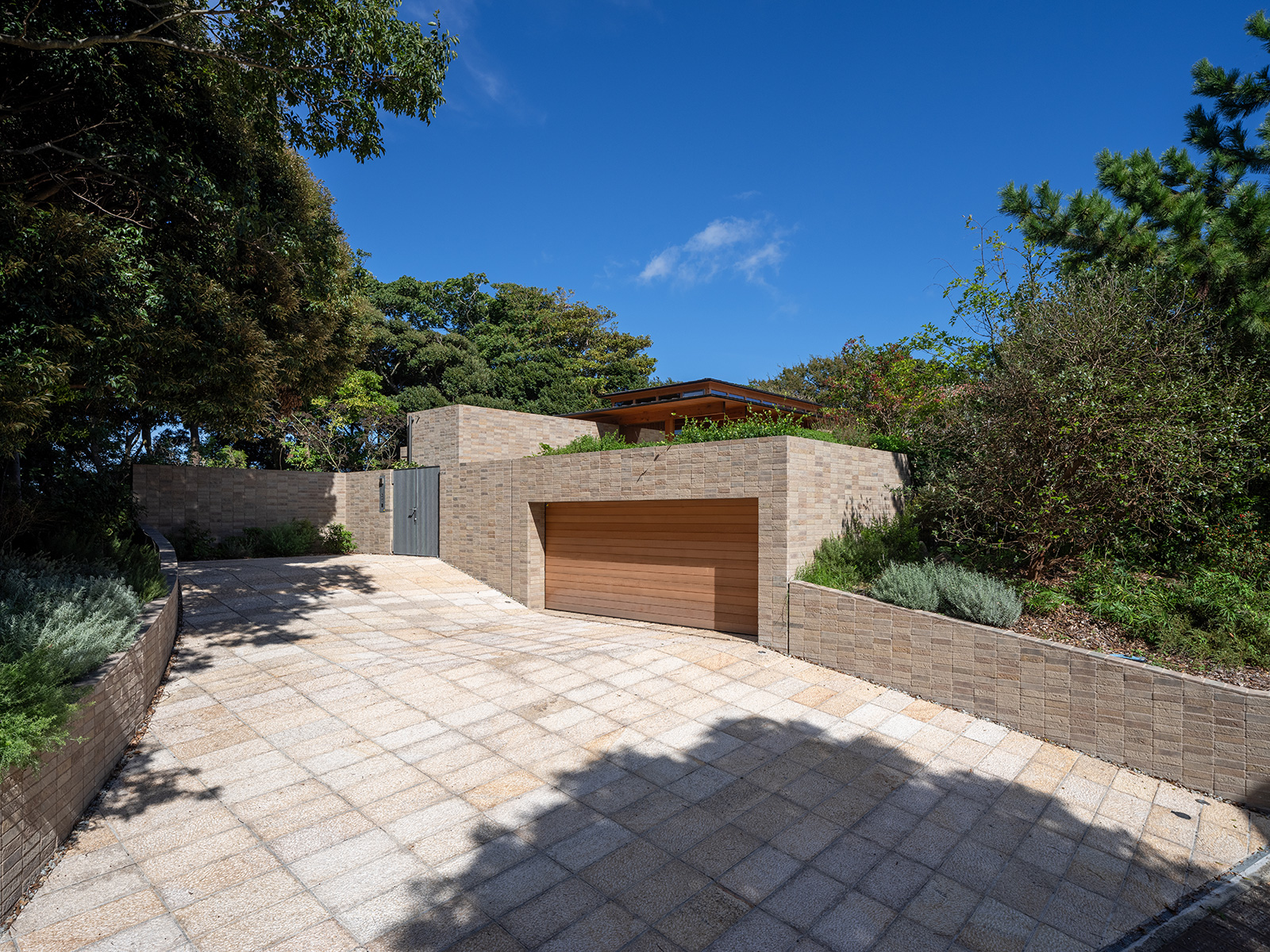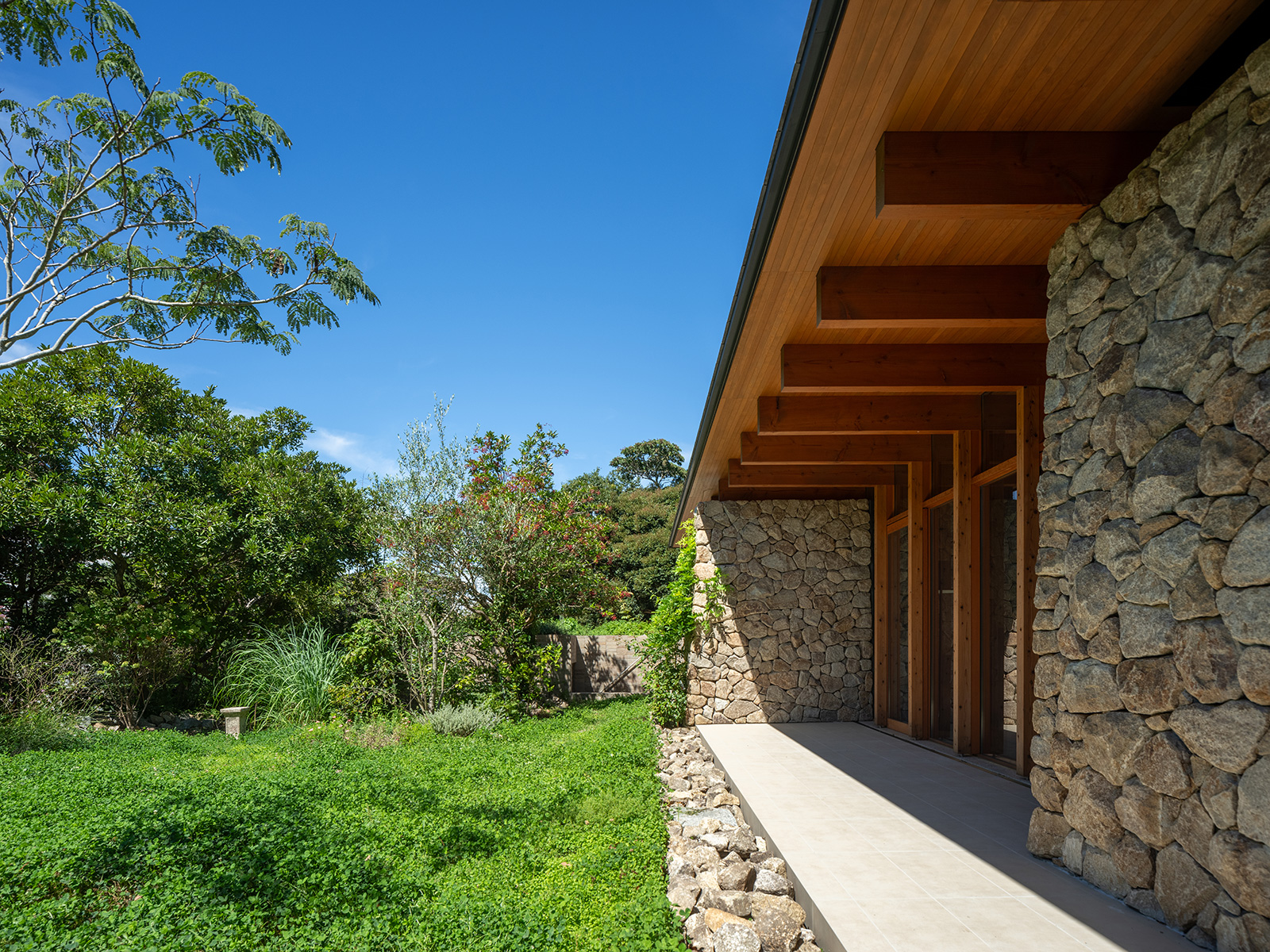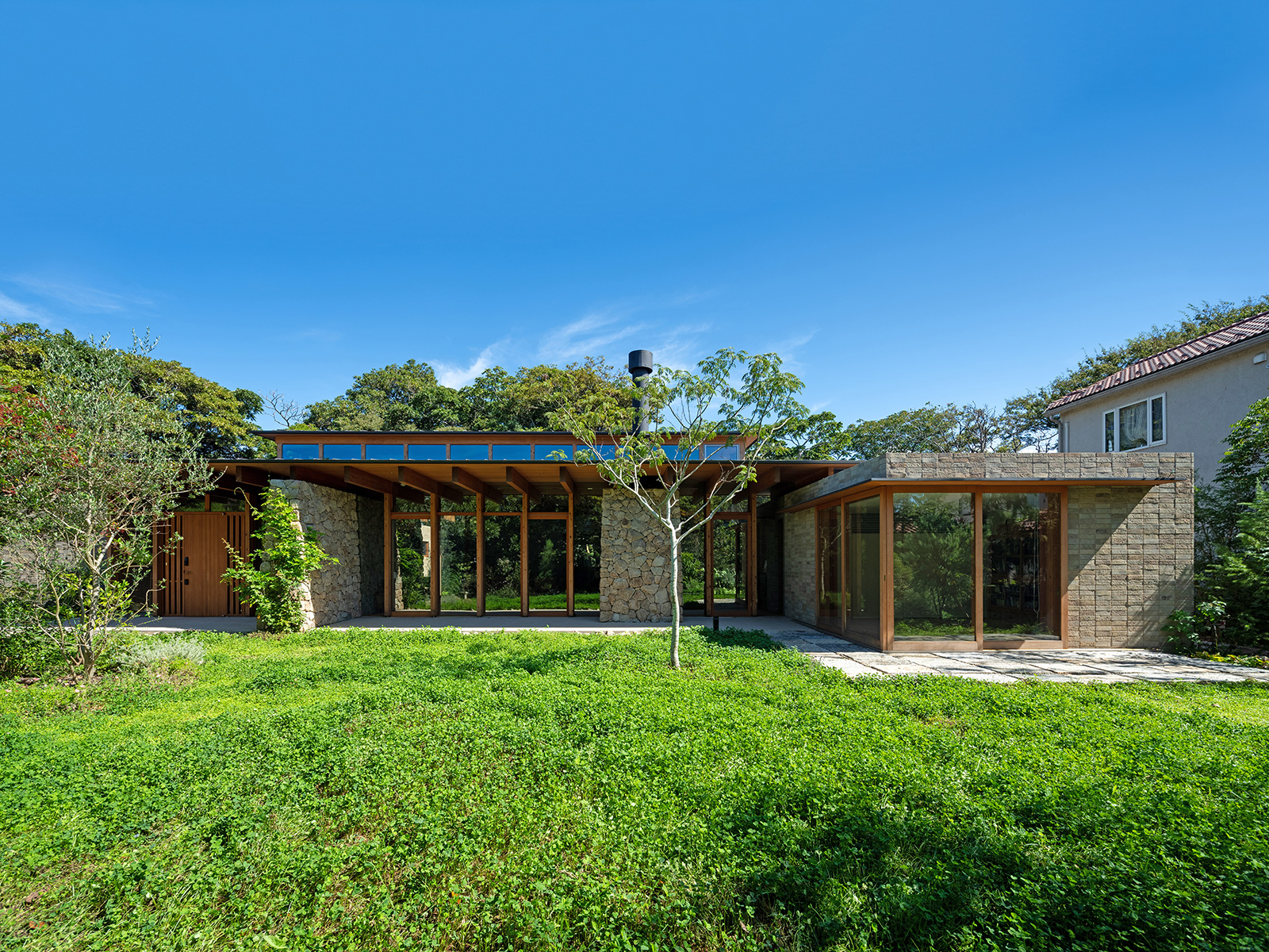 東京近郊、約1,000㎡の敷地に計画された戸建住宅。都市と自然の接点に位置し、東側には隣家が接して都市的スケールを示す一方、西側には雑木林が広がり、自然の密度を感じさせる。四方に異なるキャラクターをもつこの周辺環境に応答し、5つの個室ボリュームを丁寧に配置。そのあいだに庭を挿入することで、「開放感」と「親密さ」のバランスを調整した。ボリュームに囲まれた中央のスペースにはリビングダイニングを設け、上部にはそれらをまたぐように大梁を架け、その梁上に立てた束が屋根を支持しつつ、吹き抜けを形成している。空と光を導くこの垂直の抜けが「開放感」を、構造の量感が「親密さ」を生み出す。都市と自然の境界において、内と外、建築と環境の関係を再定義する構成である。