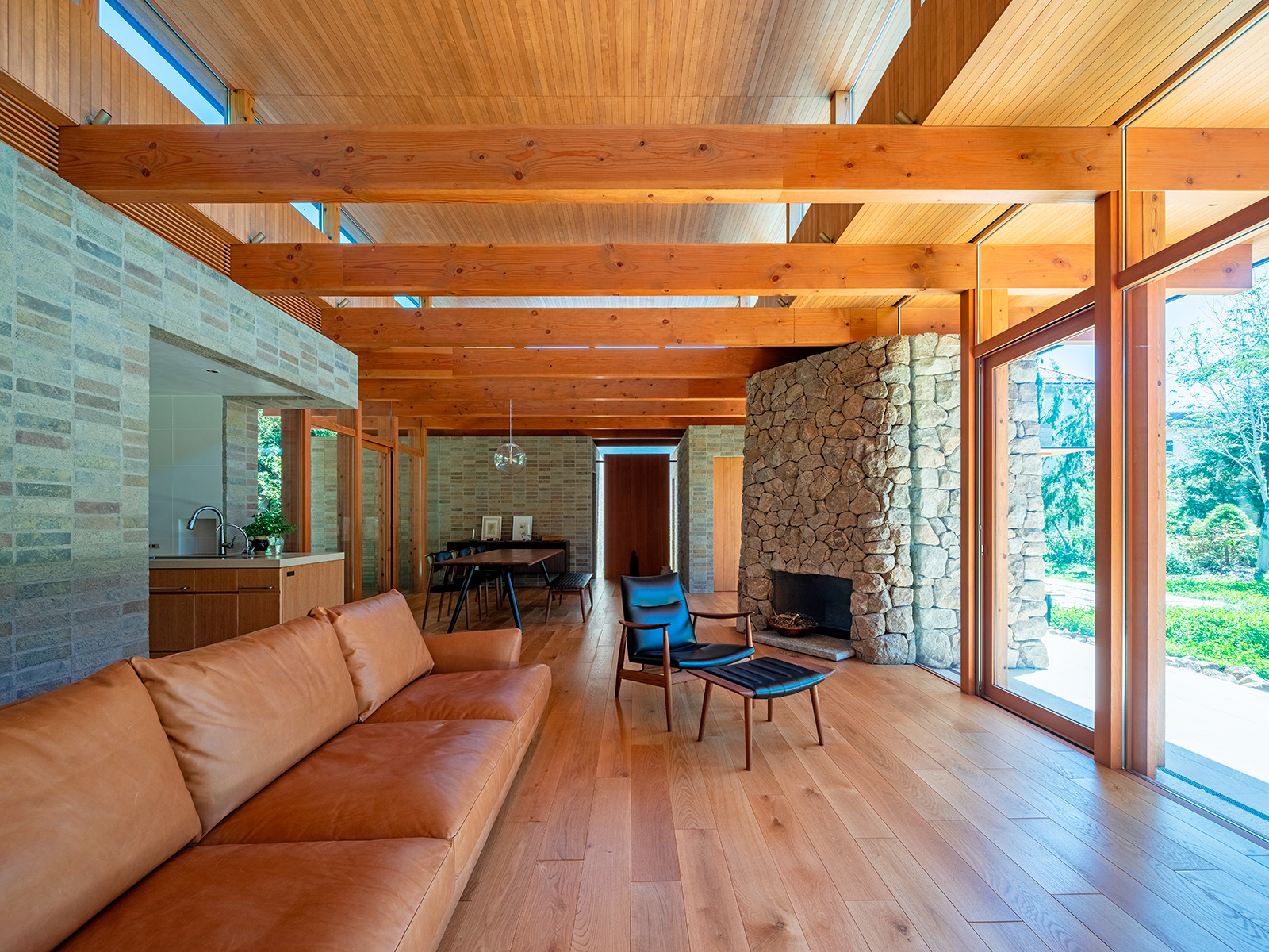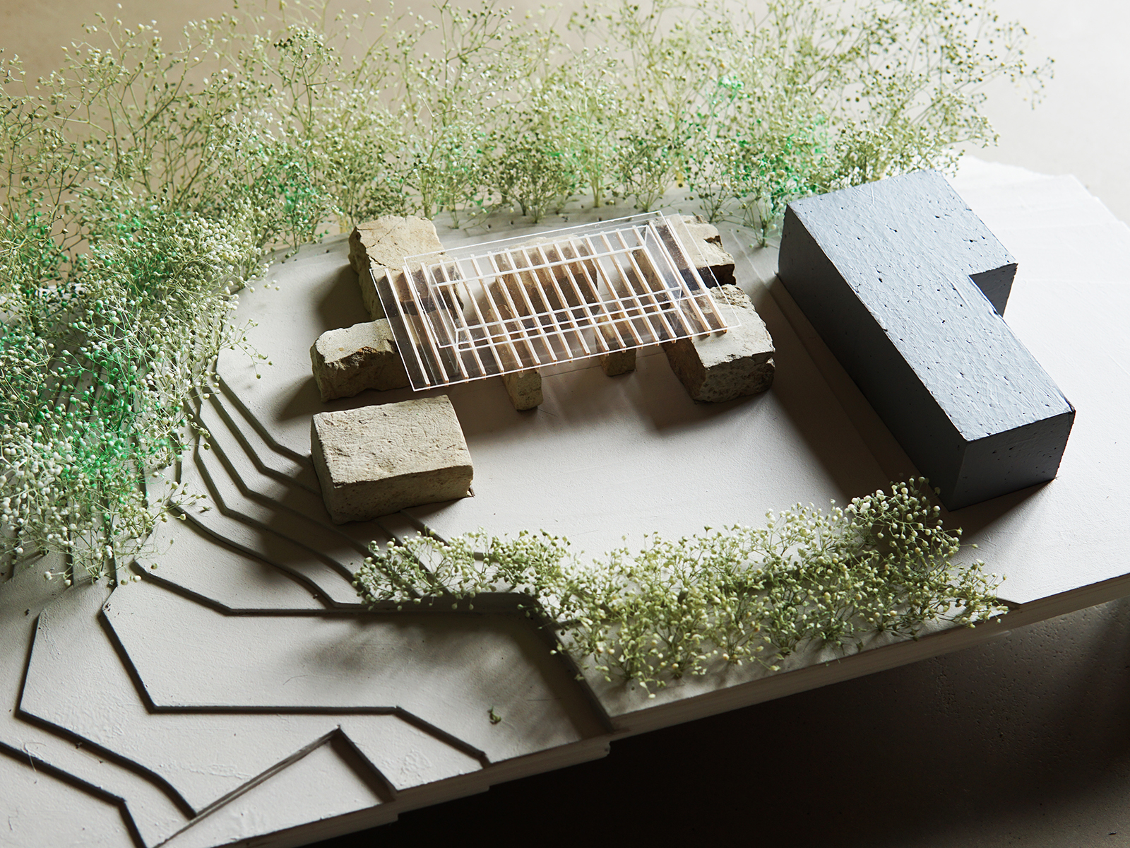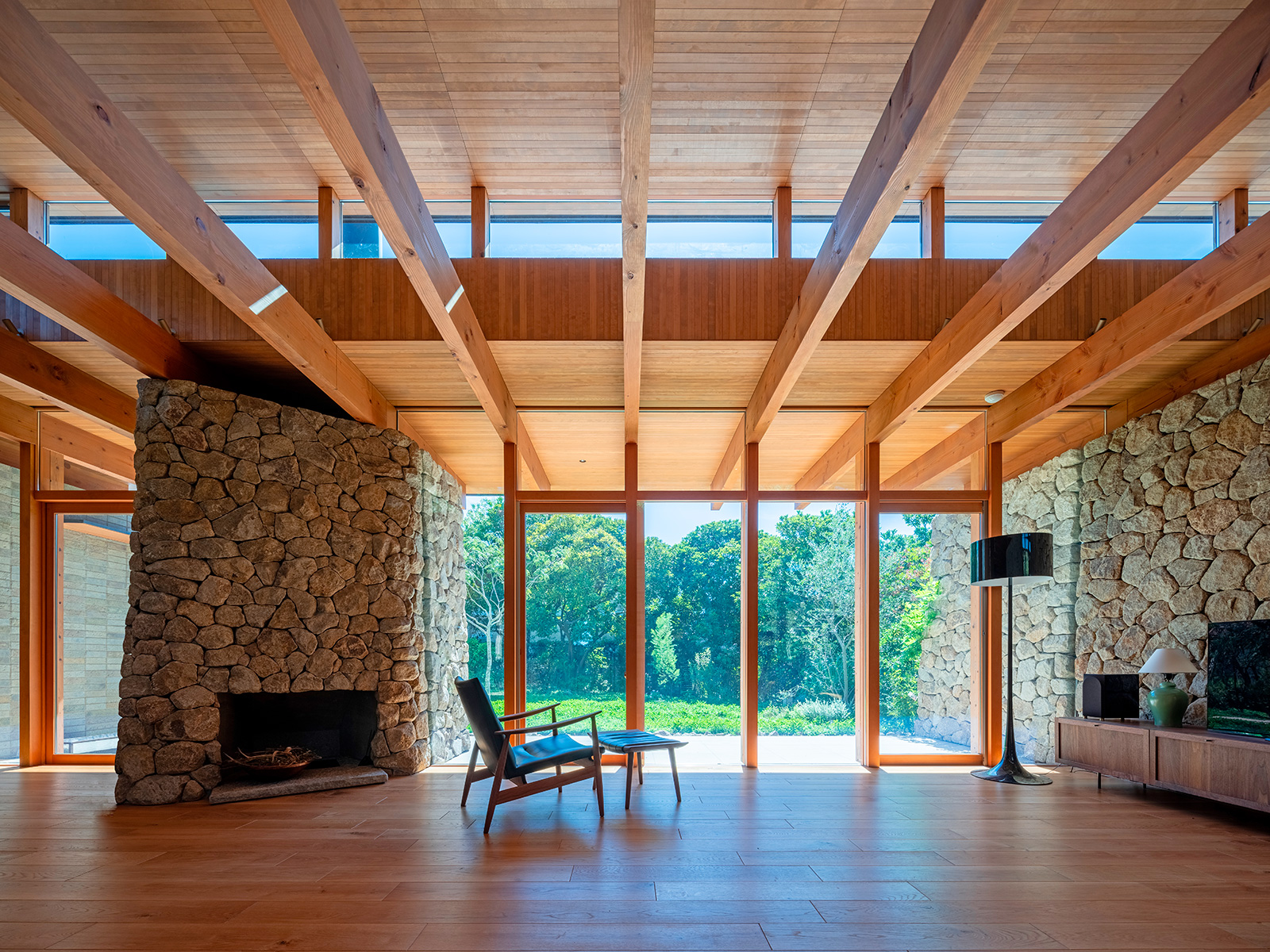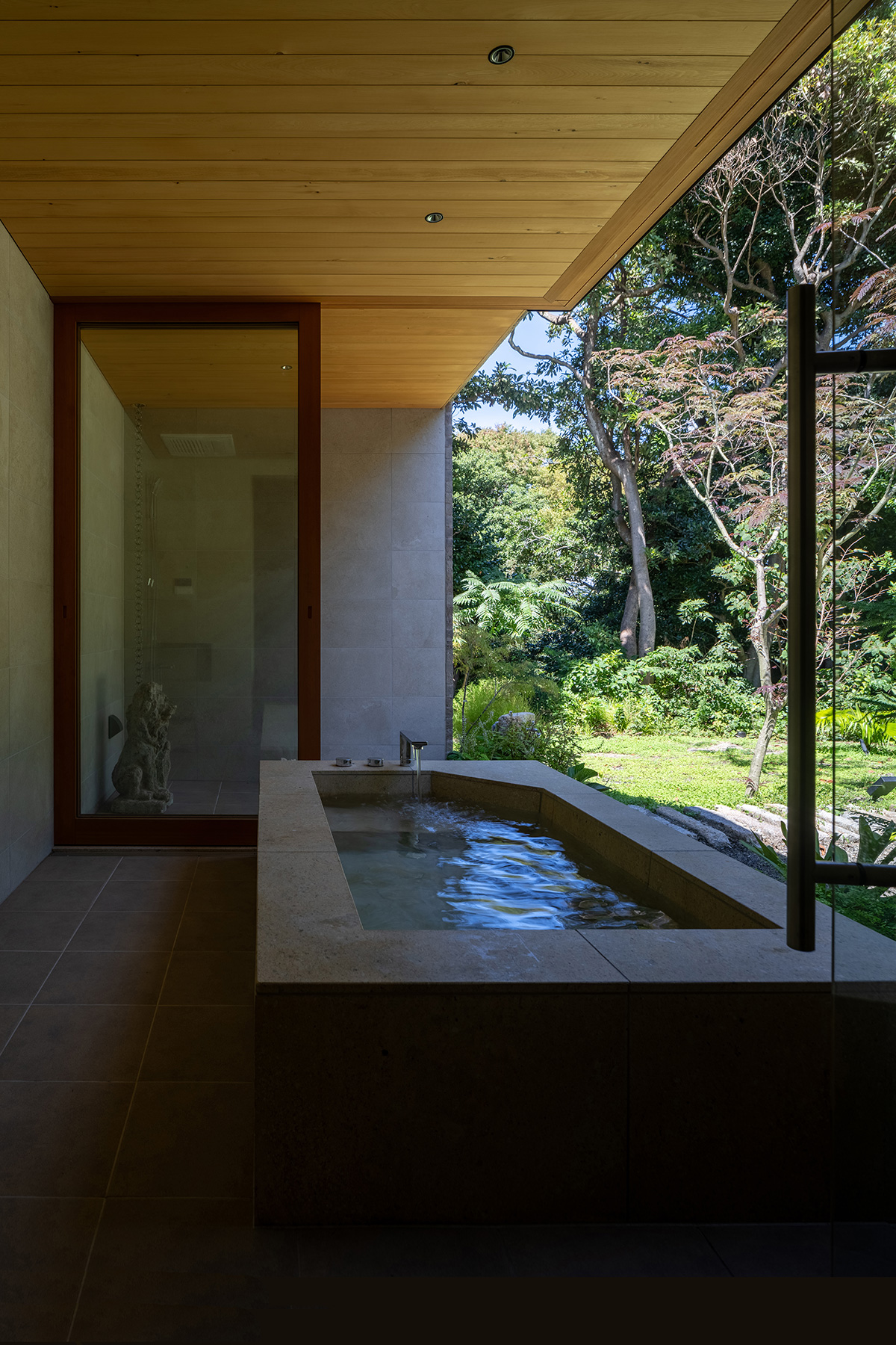 東京近郊、約1,000㎡の敷地に計画された戸建住宅。都市と自然の接点に位置し、東側には隣家が接して都市的スケールを示す一方、西側には雑木林が広がり、自然の密度を感じさせる。四方に異なるキャラクターをもつこの周辺環境に応答し、5つの個室ボリュームを丁寧に配置。そのあいだに庭を挿入することで、「開放感」と「親密さ」のバランスを調整した。ボリュームに囲まれた中央のスペースにはリビングダイニングを設け、上部にはそれらをまたぐように大梁を架け、その梁上に立てた束が屋根を支持しつつ、吹き抜けを形成している。空と光を導くこの垂直の抜けが「開放感」を、構造の量感が「親密さ」を生み出す。都市と自然の境界において、内と外、建築と環境の関係を再定義する構成である。