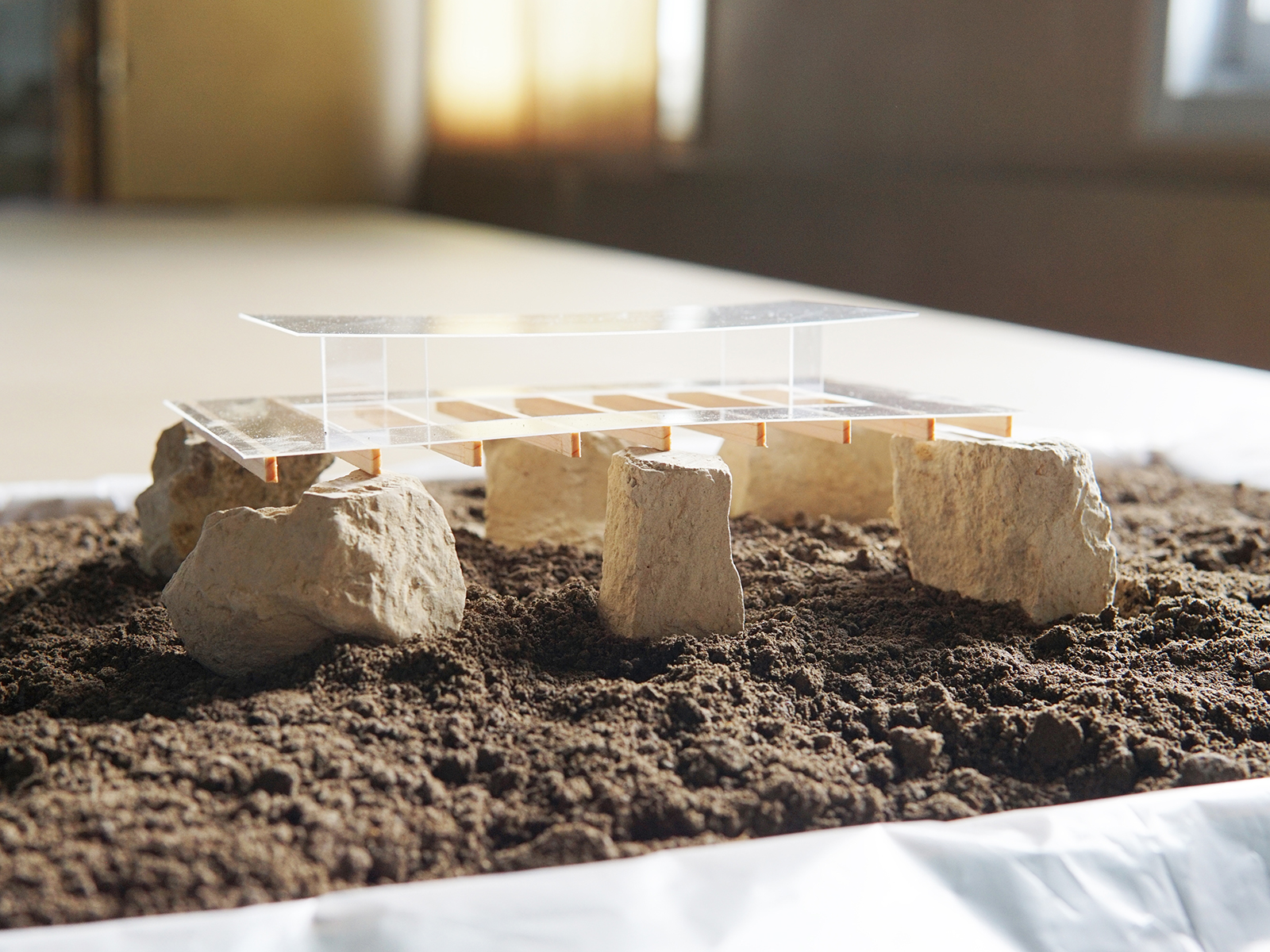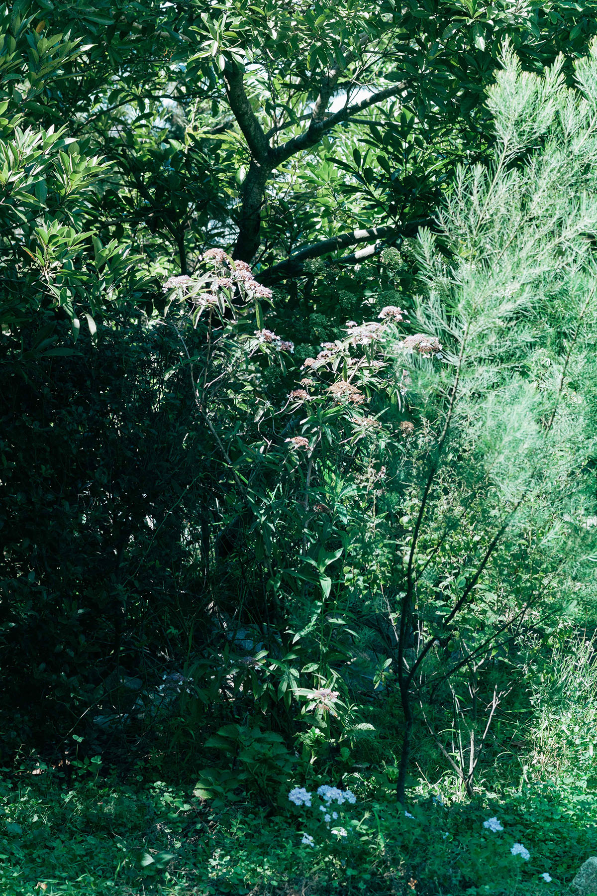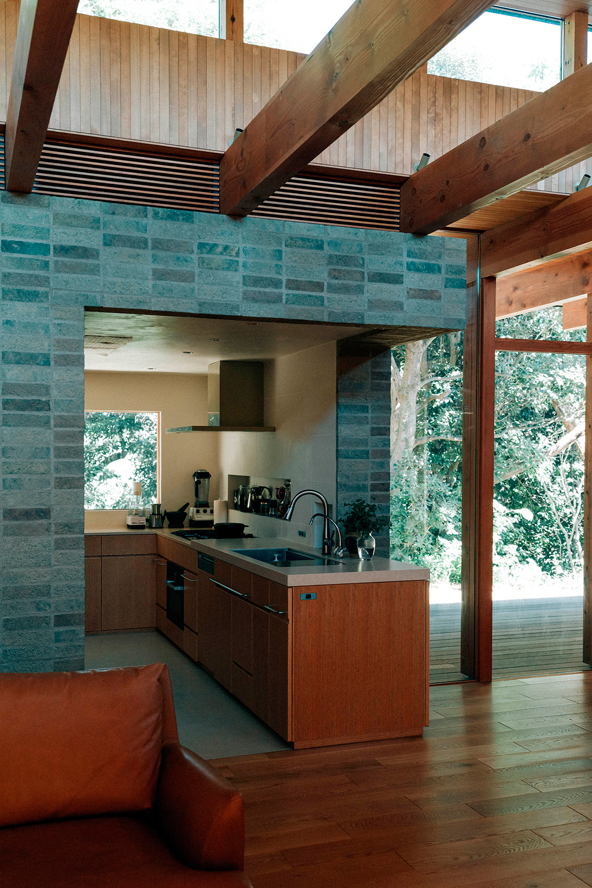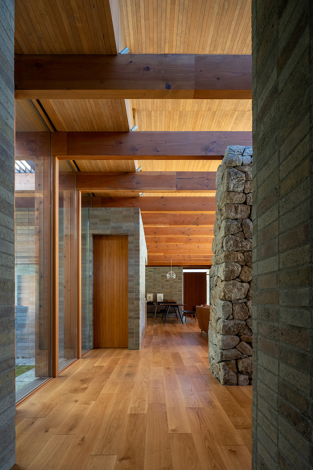東京近郊、約1,000㎡の敷地に計画された戸建住宅。都市と自然の接点に位置し、東側には隣家が接して都市的スケールを示す一方、西側には雑木林が広がり、自然の密度を感じさせる。四方に異なるキャラクターをもつこの周辺環境に応答し、5つの個室ボリュームを丁寧に配置。そのあいだに庭を挿入することで、「開放感」と「親密さ」のバランスを調整した。ボリュームに囲まれた中央のスペースにはリビングダイニングを設け、上部にはそれらをまたぐように大梁を架け、その梁上に立てた束が屋根を支持しつつ、吹き抜けを形成している。空と光を導くこの垂直の抜けが「開放感」を、構造の量感が「親密さ」を生み出す。都市と自然の境界において、内と外、建築と環境の関係を再定義する構成である。