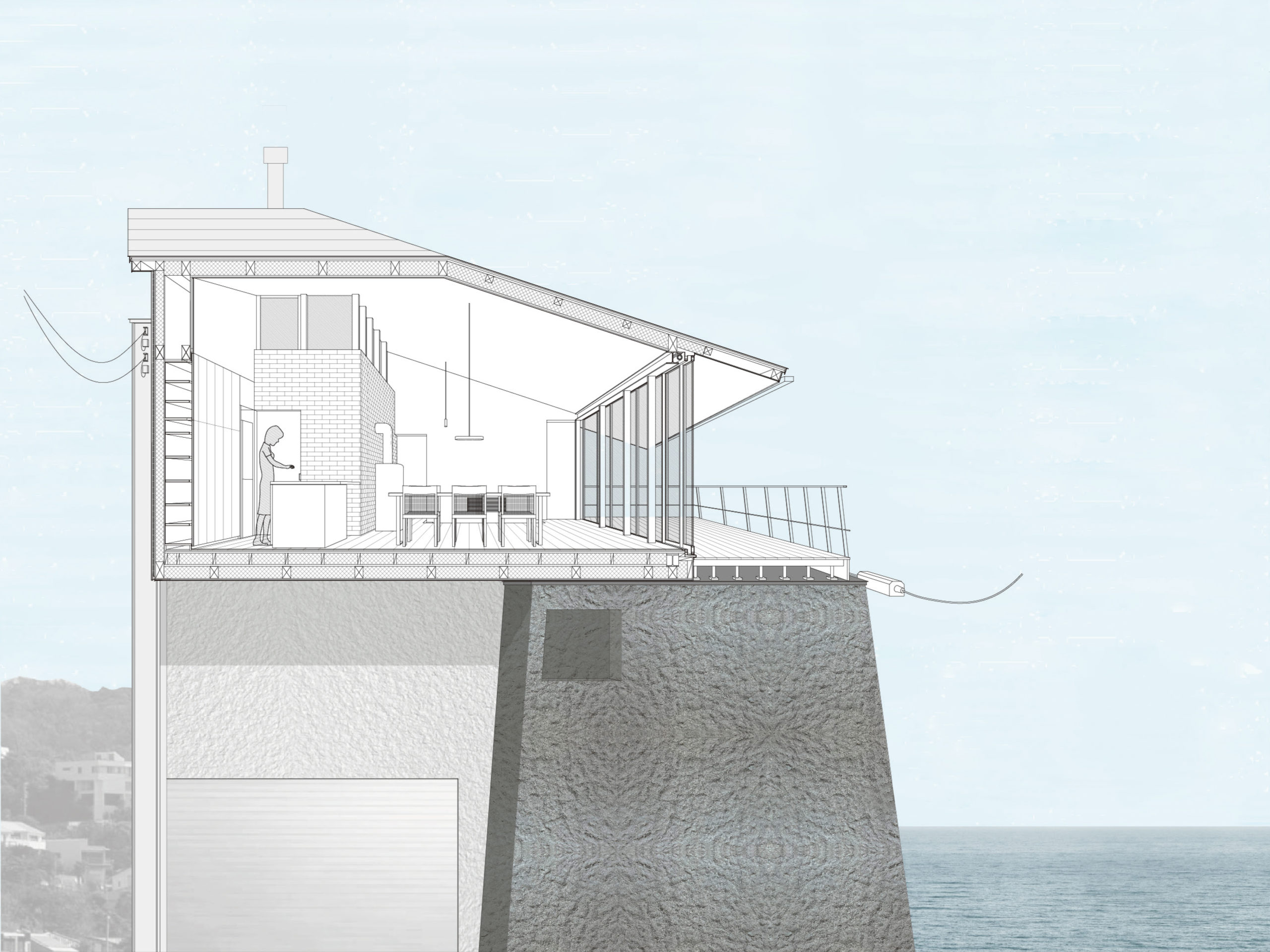 近代建築運動以降、イミテーションは軽視されがちな建築要素であるが、技術的洗練を経た模造は、もはや単なる代用品ではないと考えている。本計画では、素材・構成の両面においてイミテーションを肯定的に導入し、建築的主題として展開した。敷地は国道134号沿い、古今東西の様式を模した住宅が建ち並ぶ別荘街に位置する。木造2階建ての本建築は、RC造に見える「崖」の上に鉄骨造のように見える平屋を重ねた二層構成とし、上層に配したLDKからは相模湾のパノラマが広がる。仕上げには人工木やプリントタイルなど、意図的にイミテーション素材を用い、構法・構成・素材を横断して模倣を主題化している。現代技術がもたらす快適性への賛歌と、建築におけるオーセンティシティ信仰への批評性とを併存させる試みである。